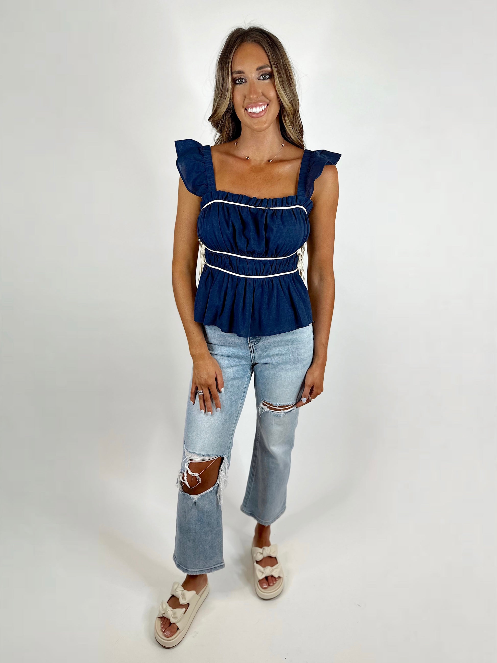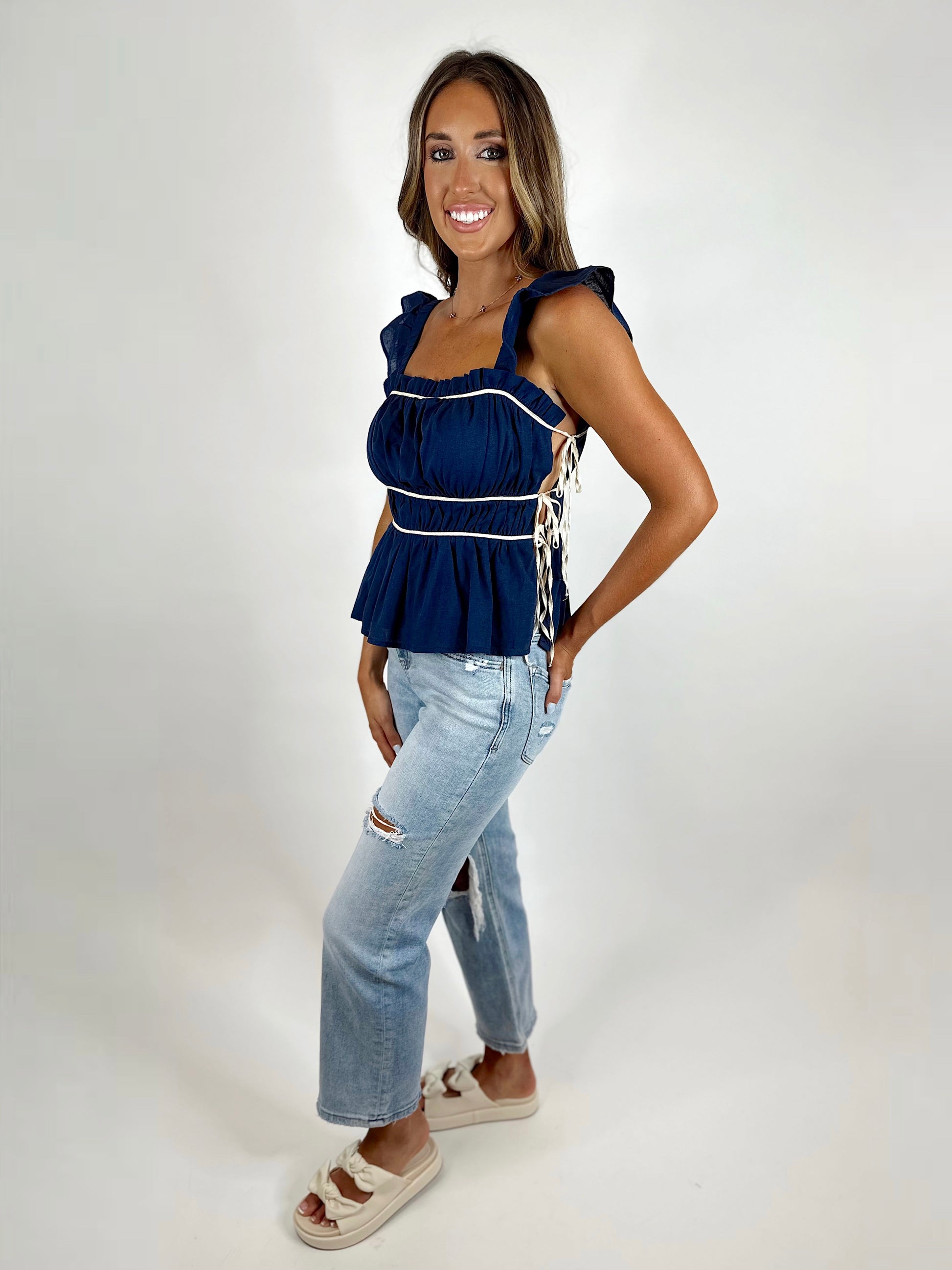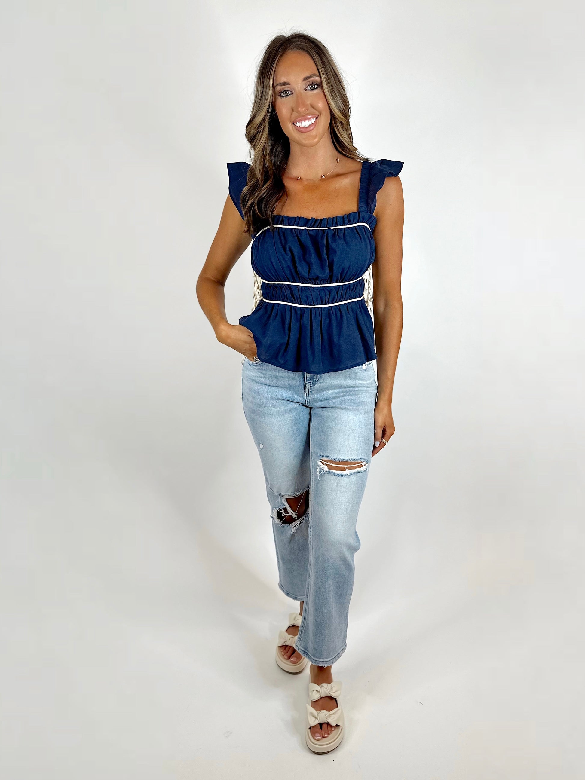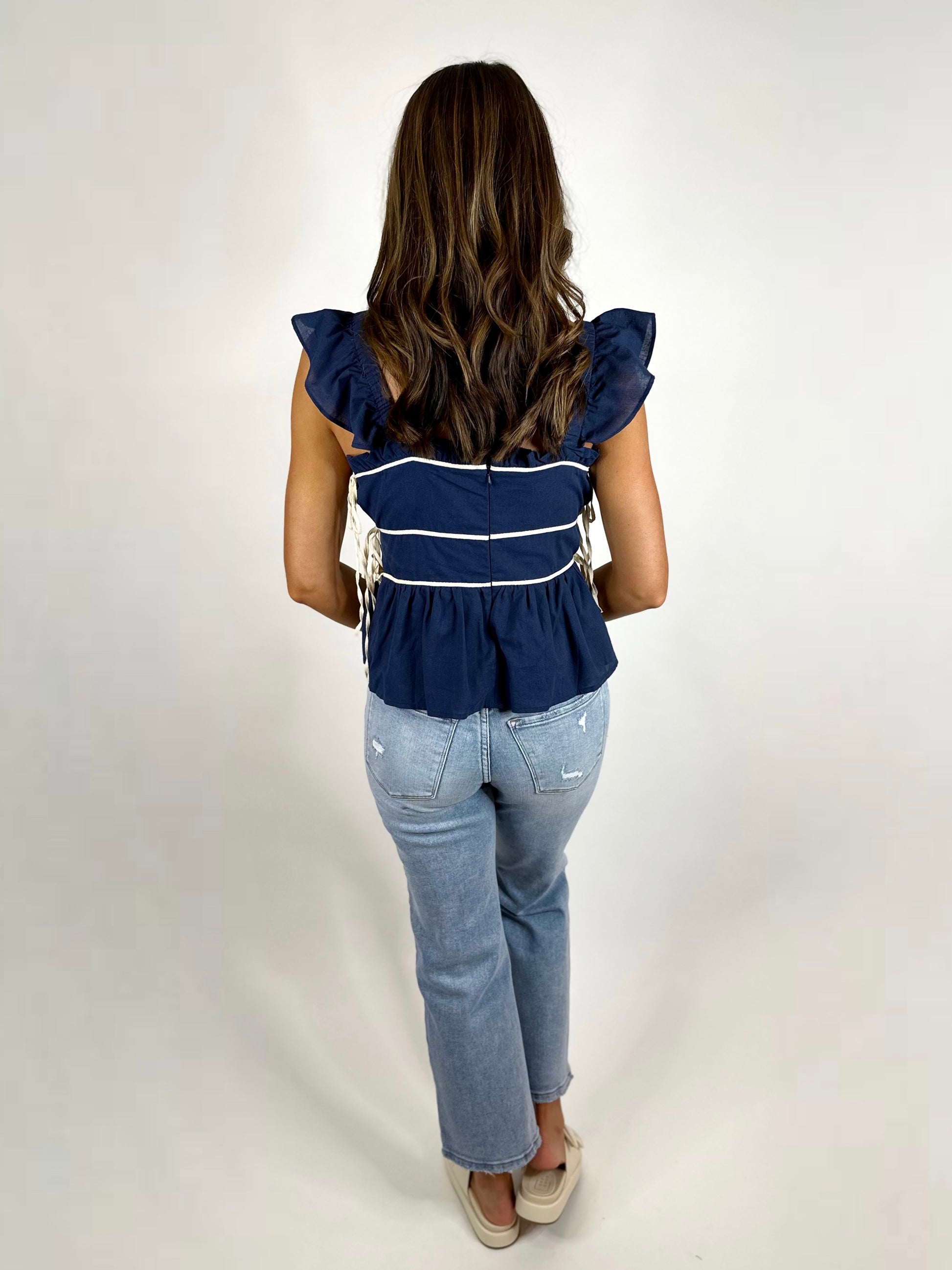 - Step up your fashion game with our Bow Bliss Top! This playful piece features ruched detailing that flatters your waist and bust, along with ruffled straps for a touch of whimsy. Complete with self tie bow closures and a back zipper for easy wear. Dressing up has never been so fun!