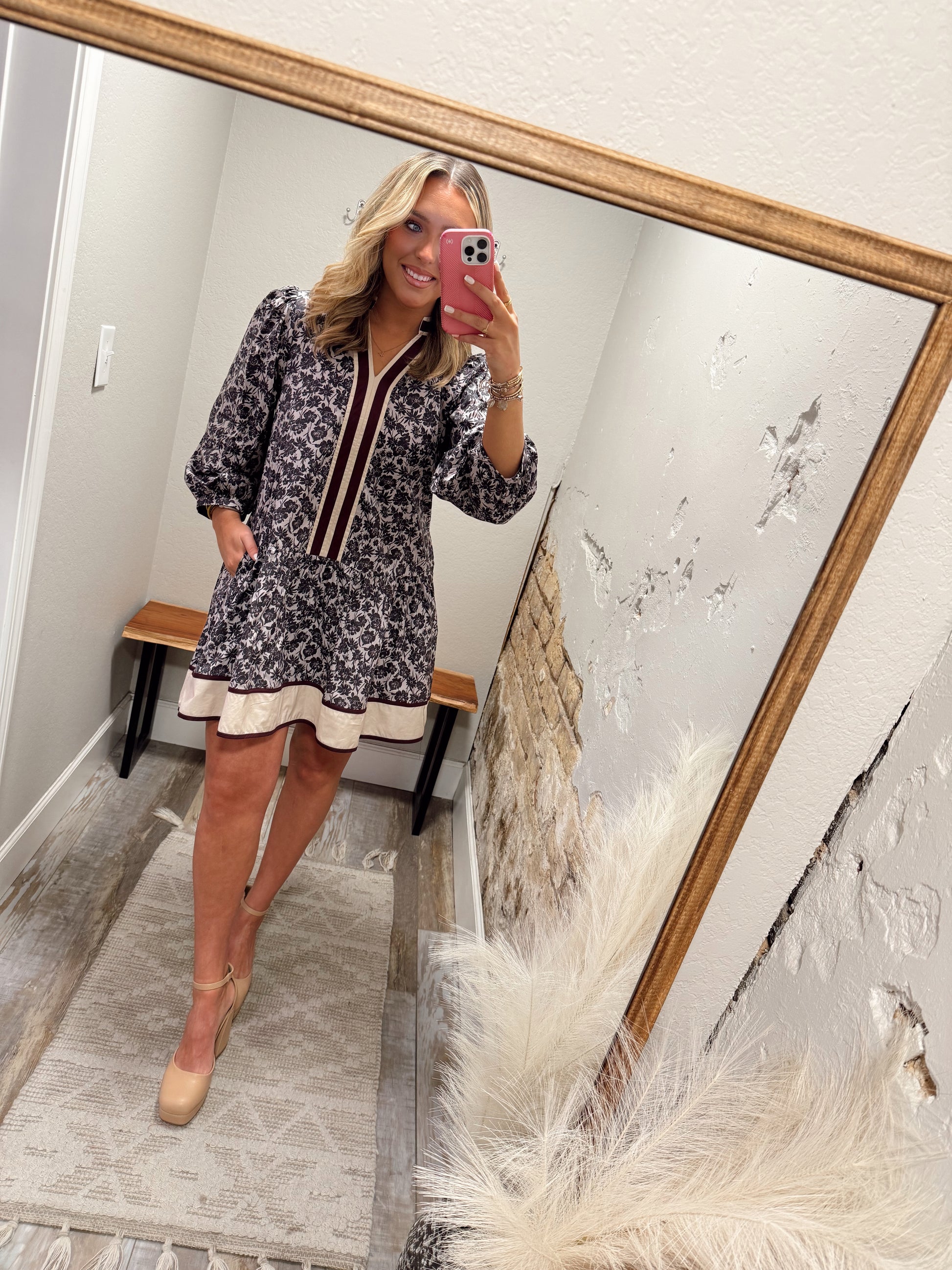 - The Deep Bloom Dress features a vibrant floral print with a split neckline trimmed in contrasting detail. Three-quarter puff sleeves and a mini length create an elegant silhouette, while side pockets add everyday practicality. The coordinating contrast hem ties the look together beautifully. Dress is lined.