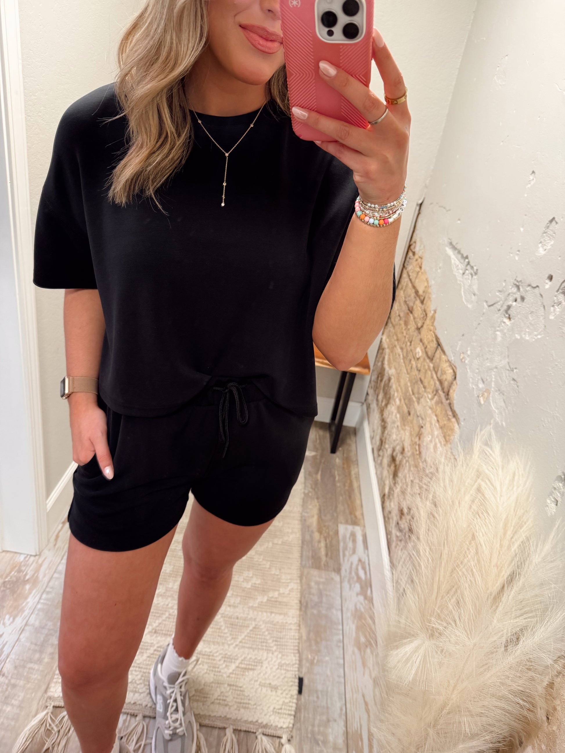 - Buttery soft set featuring a boxy top paired with drawstring shorts with side pockets.
