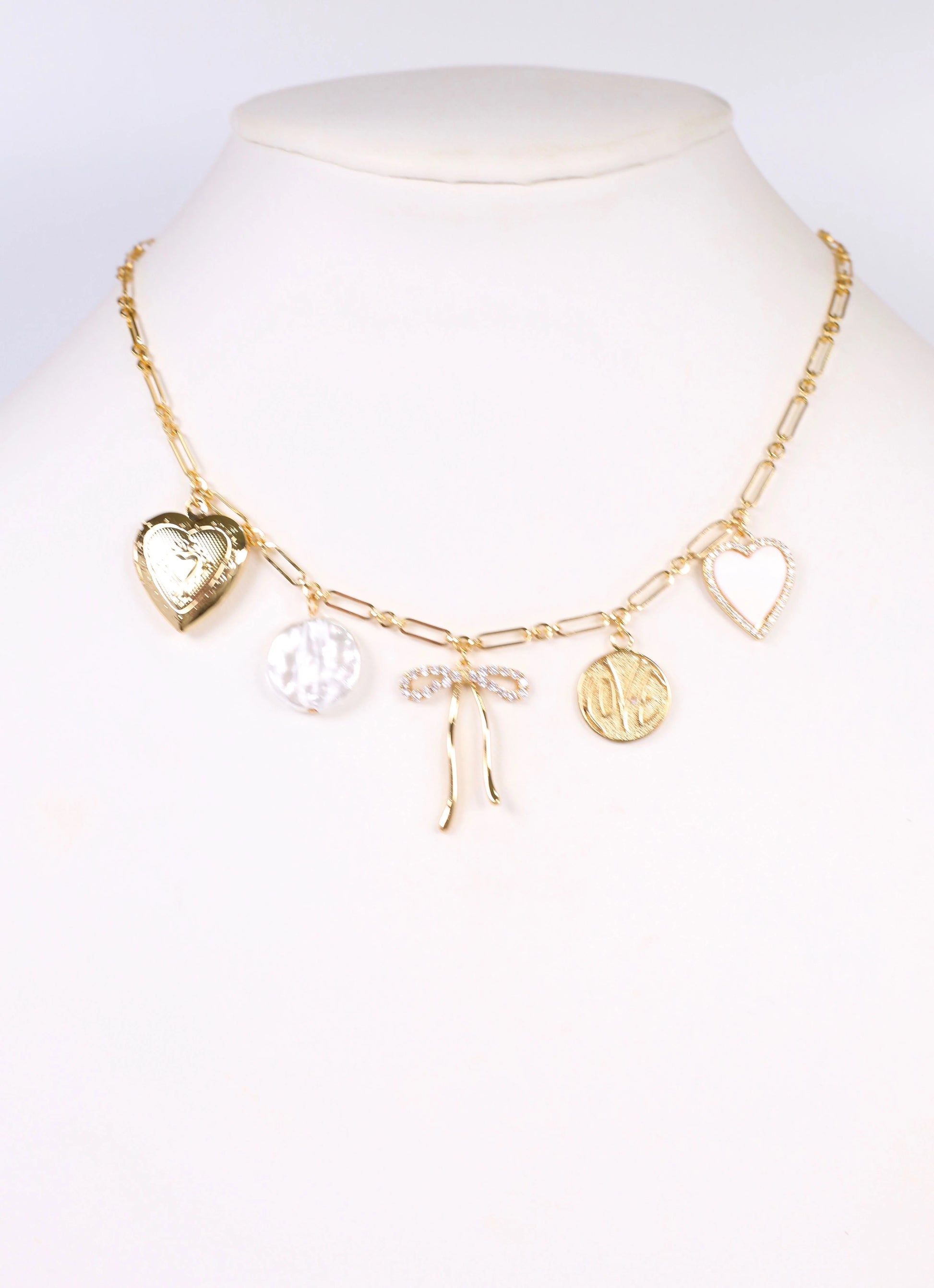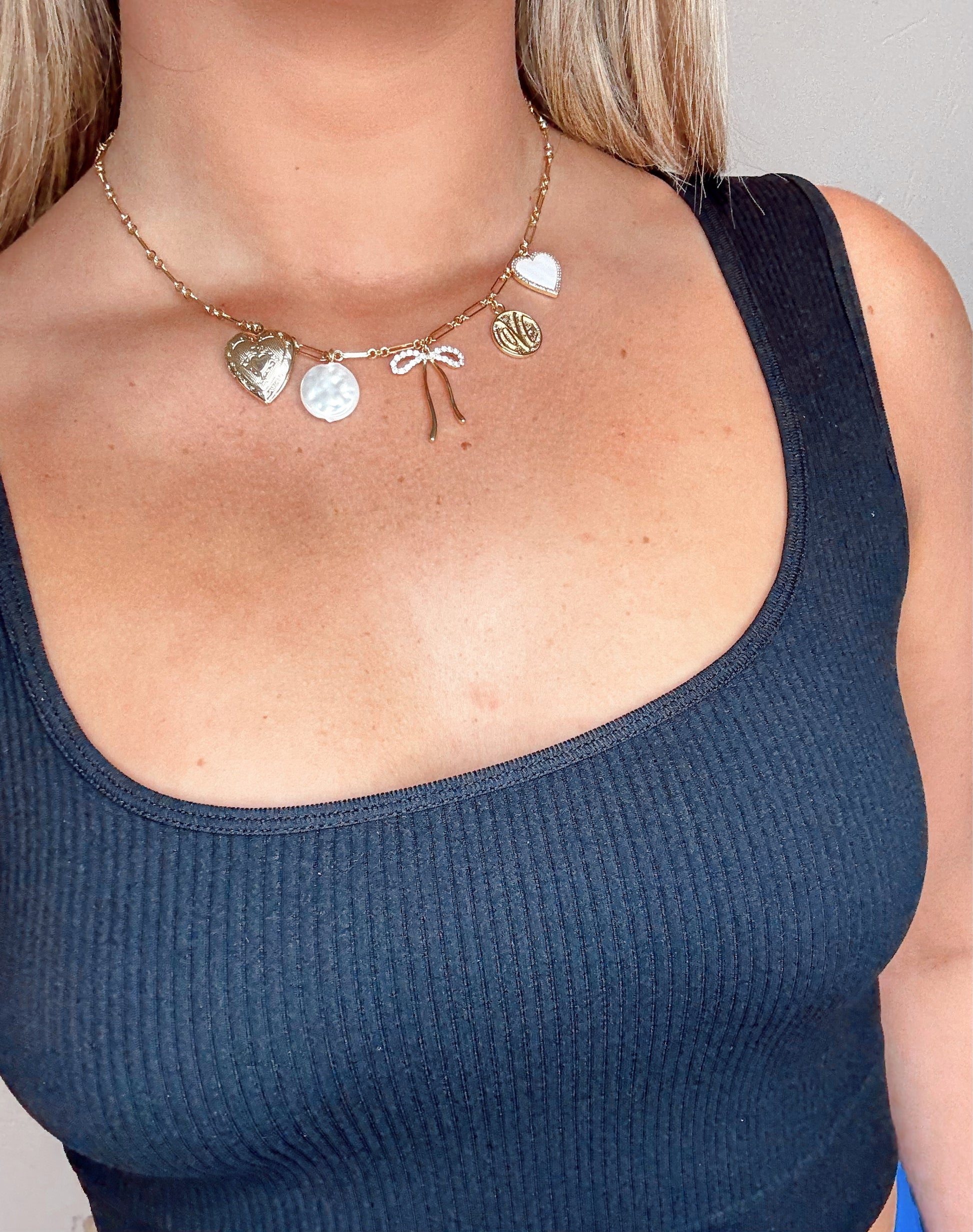 This exquisite necklace has a gorgeous mix of charms including a heart locket, flat pearl, CZ bow, charm, and CZ lined heart. Wear it as an everyday accessory or to dress up an evening look.