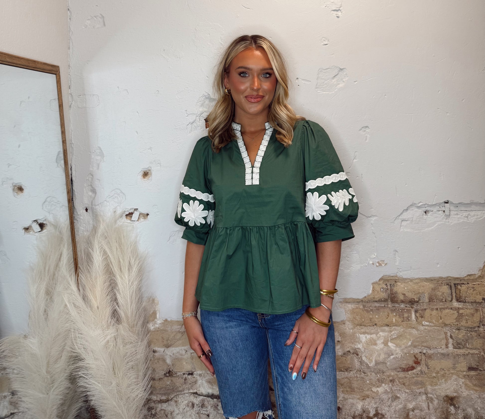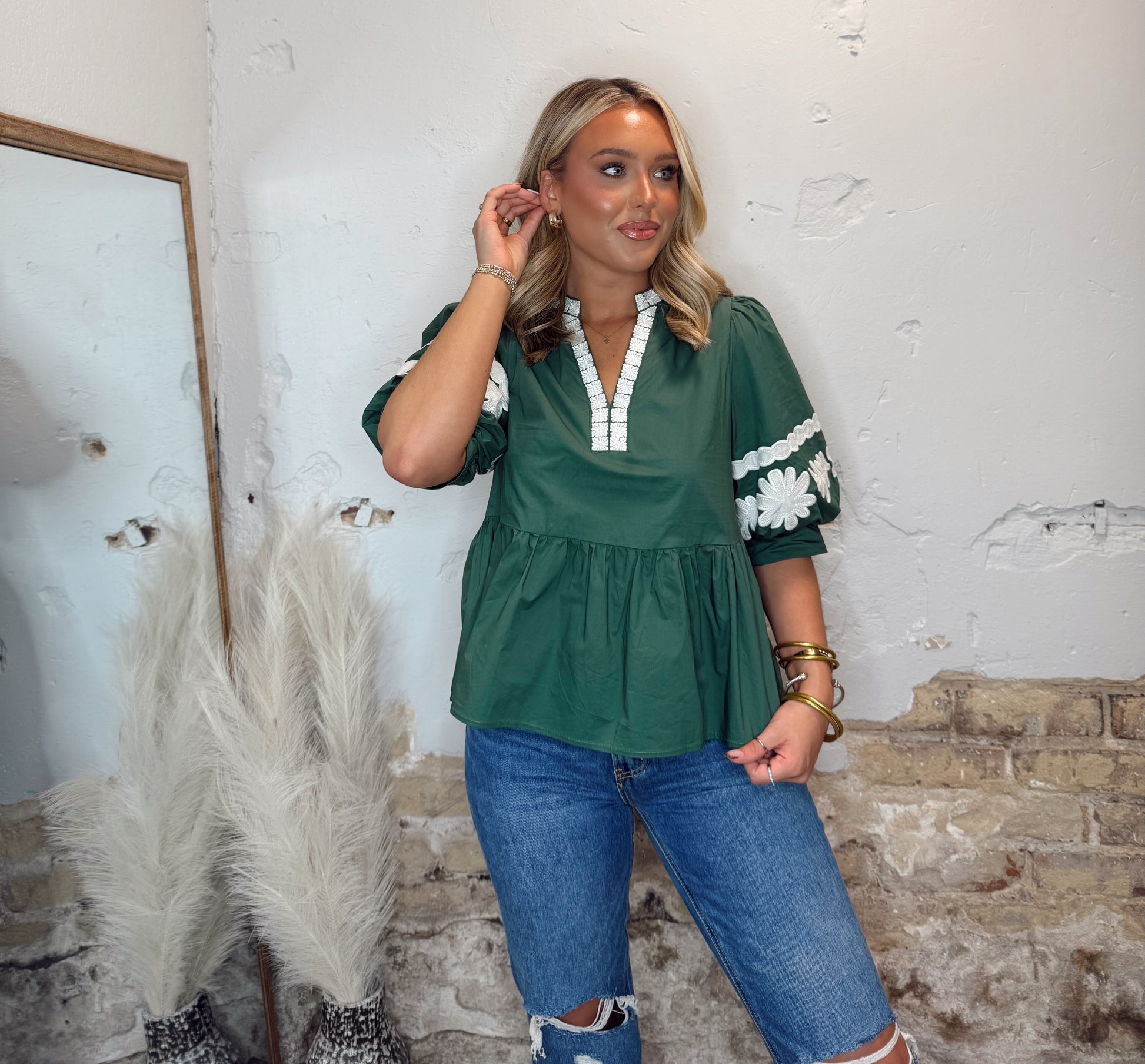 - The Evergreen Top offers a charming way to transition into fall with its solid ¾ bubble sleeves and delicate ruffle hem. Detailed with beautiful floral embroidery on the sleeves and neckline, this top combines comfort with subtle elegance.