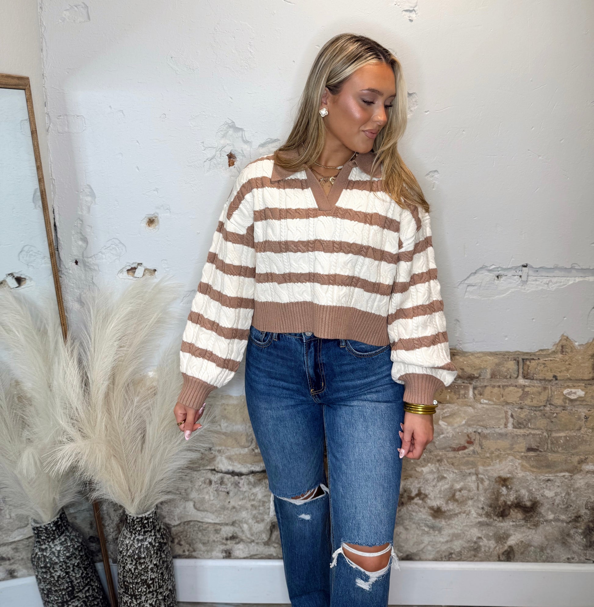 - The Fall Nights Sweater is designed to keep you comfortable and confident. Its cropped fit and collared neckline provide a flattering shape, while the stripe detailing adds a touch of charm. Perfect for layering or wearing on its own, this sweater supports your style with cozy warmth and effortless elegance.