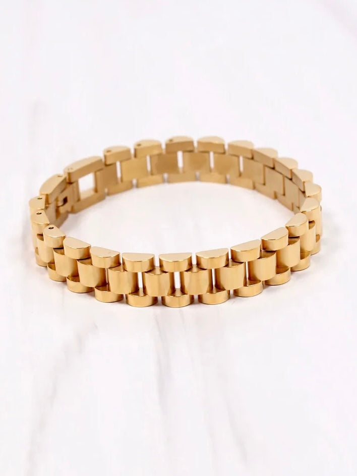 This shiny metal bracelet has a clasp closure and will be great in a full stack of bracelets. It is made with stainless steel.