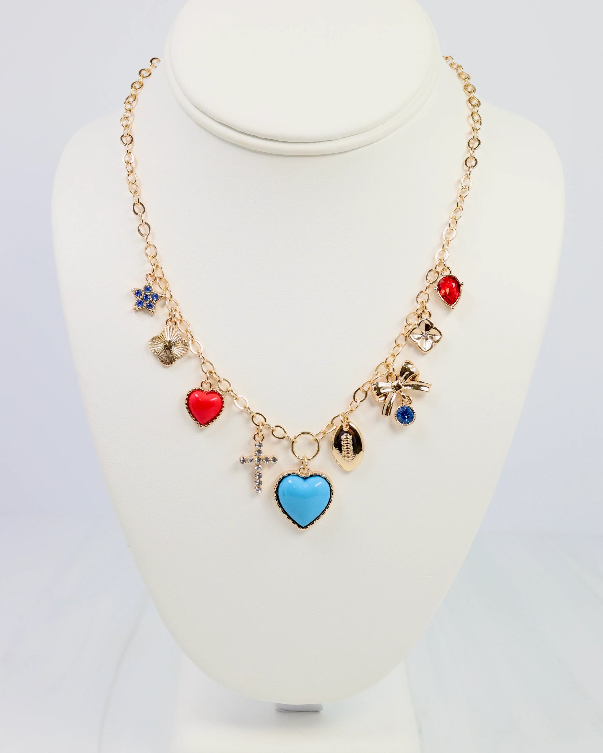 Celebrate game day in style with our Football Charm Necklace in black. This fashionable piece features two heart charms in your team colors, a football charm, and a variety of other playful accents. Perfect for showing your spirit with a chic touch, it’s a must-have accessory for every fan looking to combine passion and trend effortlessly.