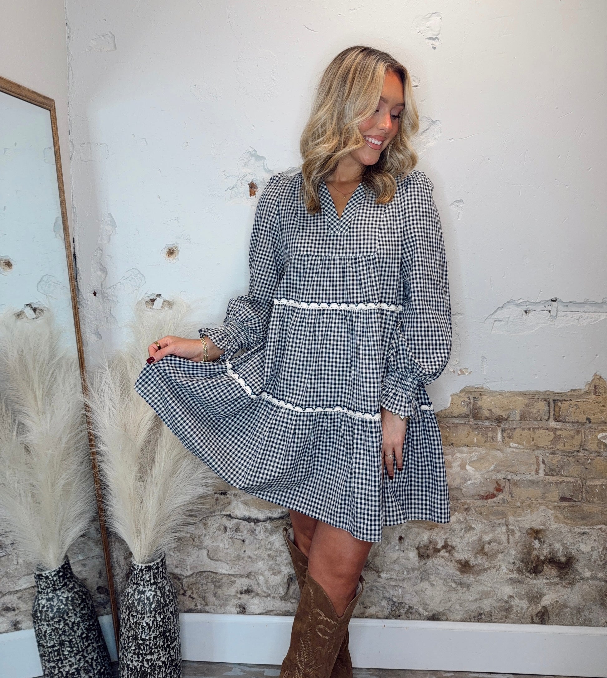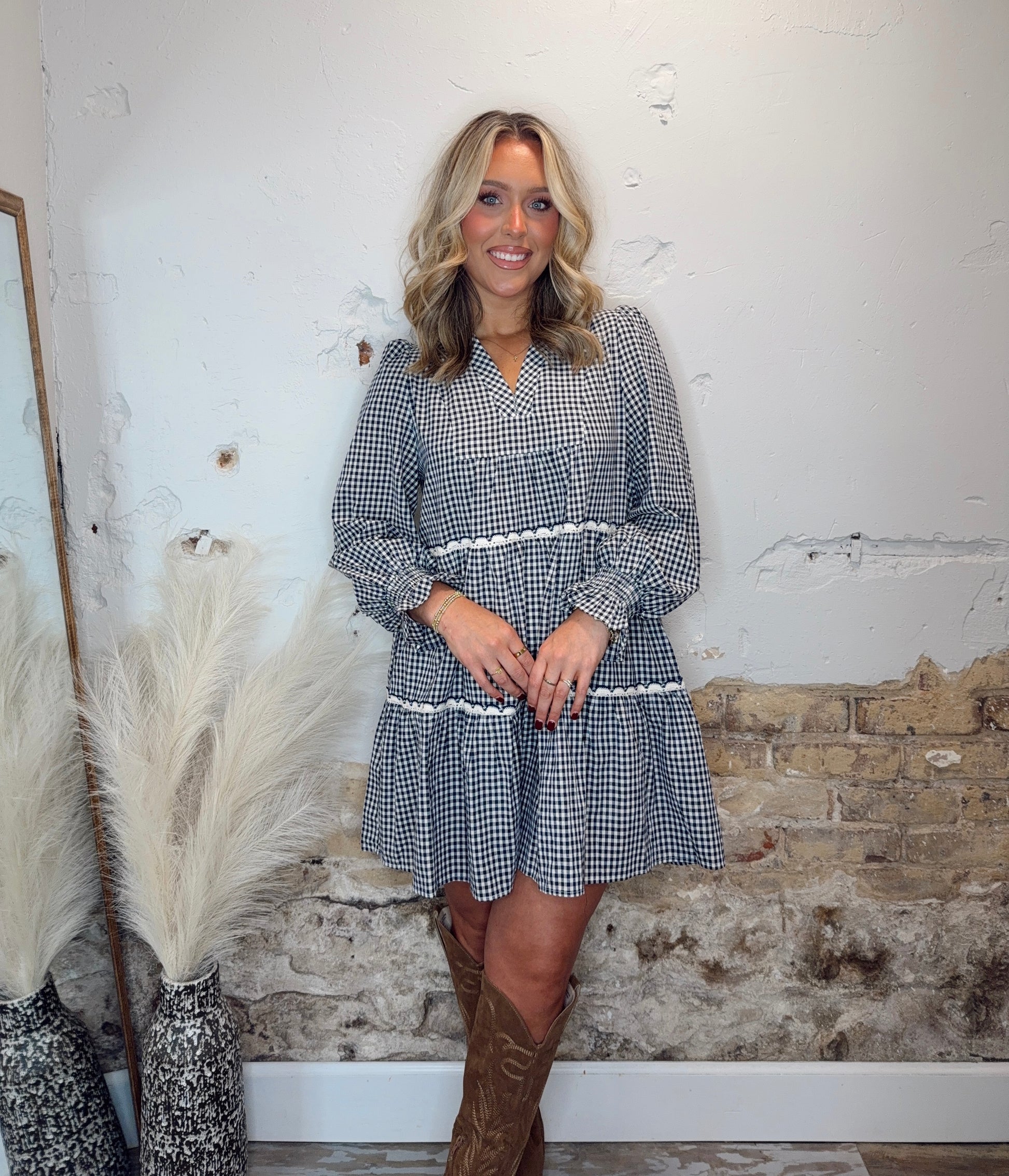 - The Gingham Sweetheart Dress brings playful charm with its V-neck and subtle ruffle trim. Scallop lace details highlight the tier seams, while smocked cuffs add a fun, fitted touch. Complete with handy side pockets and a soft lining, this long sleeve mini is perfect for effortless style.