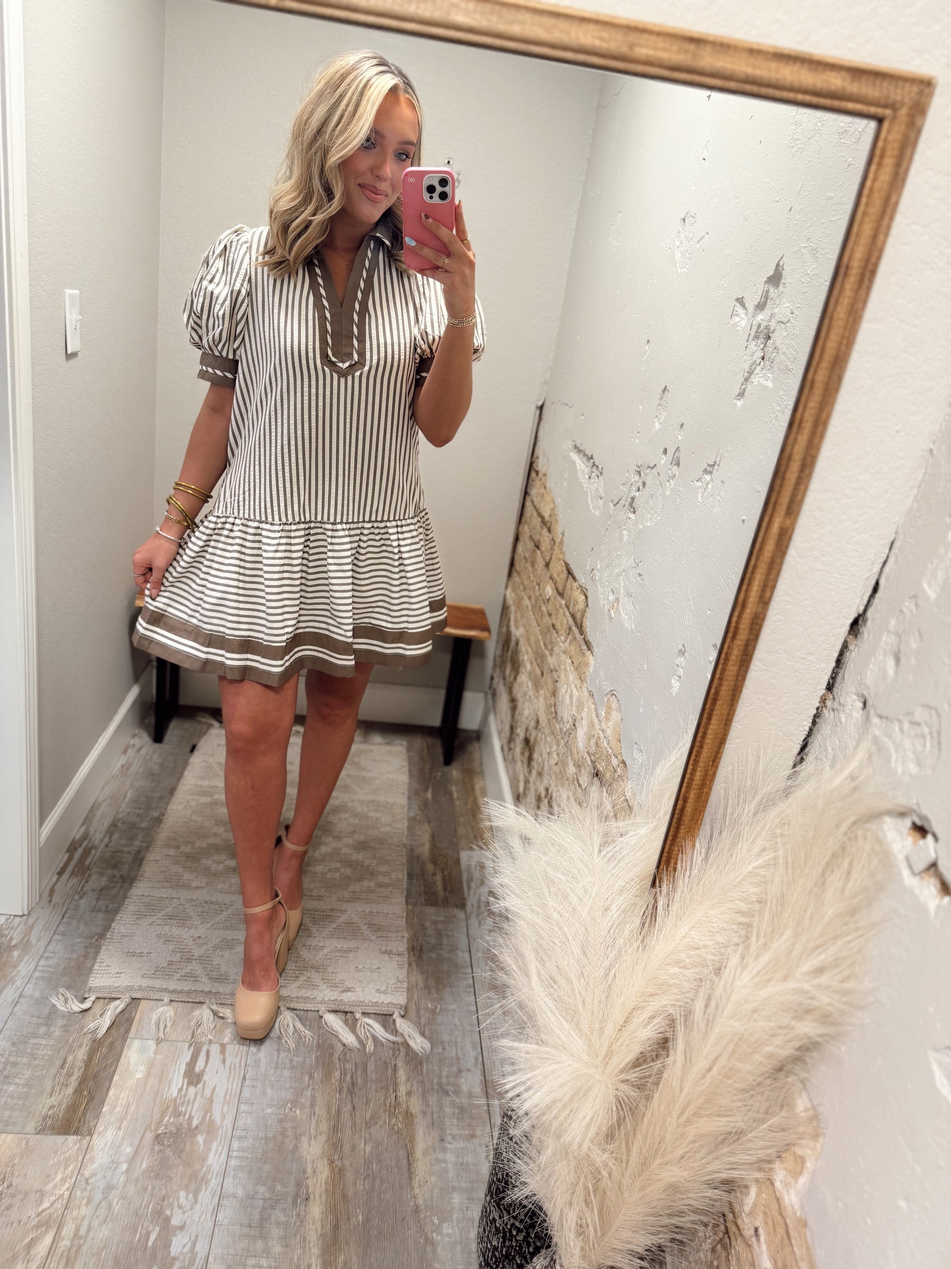 - The Harvest Babydoll Dress is a cute fall essential, featuring a textured stripe pattern and short puff sleeves for a gentle, flattering shape. Its stripe inset contrast spread collar adds a stylish edge, while convenient side pockets keep your essentials close. Fully lined for warmth and comfort, this mini dress is perfect for embracing the season with ease and charm.