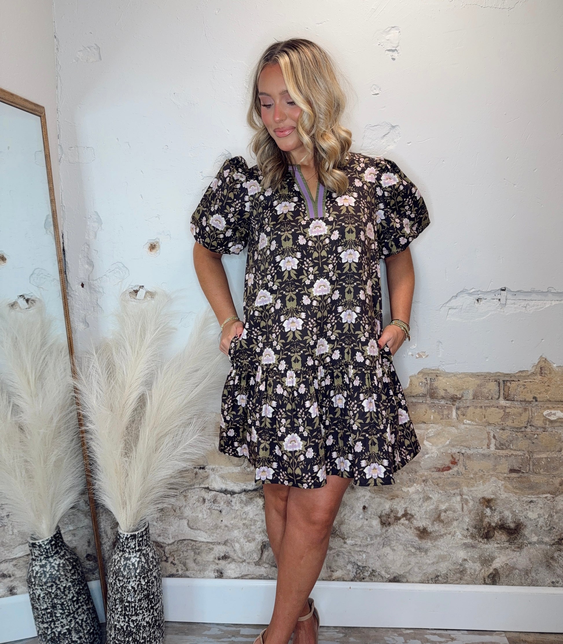 - The In The Bloom Dress is a playful mini dress with a botanical print, short puff sleeves, and a contrast V-neck. It features a ruffle hem, side pockets, and is fully lined.