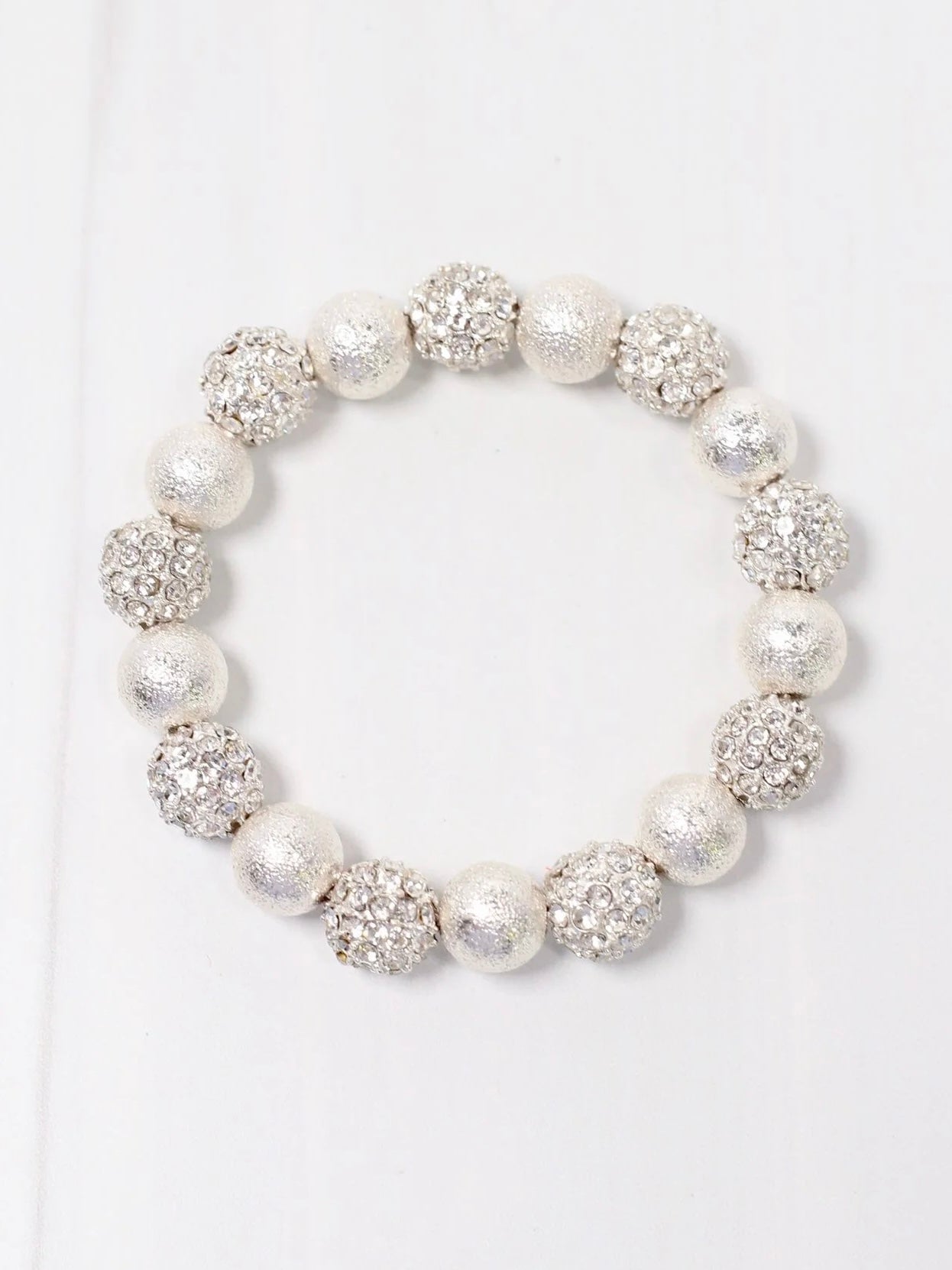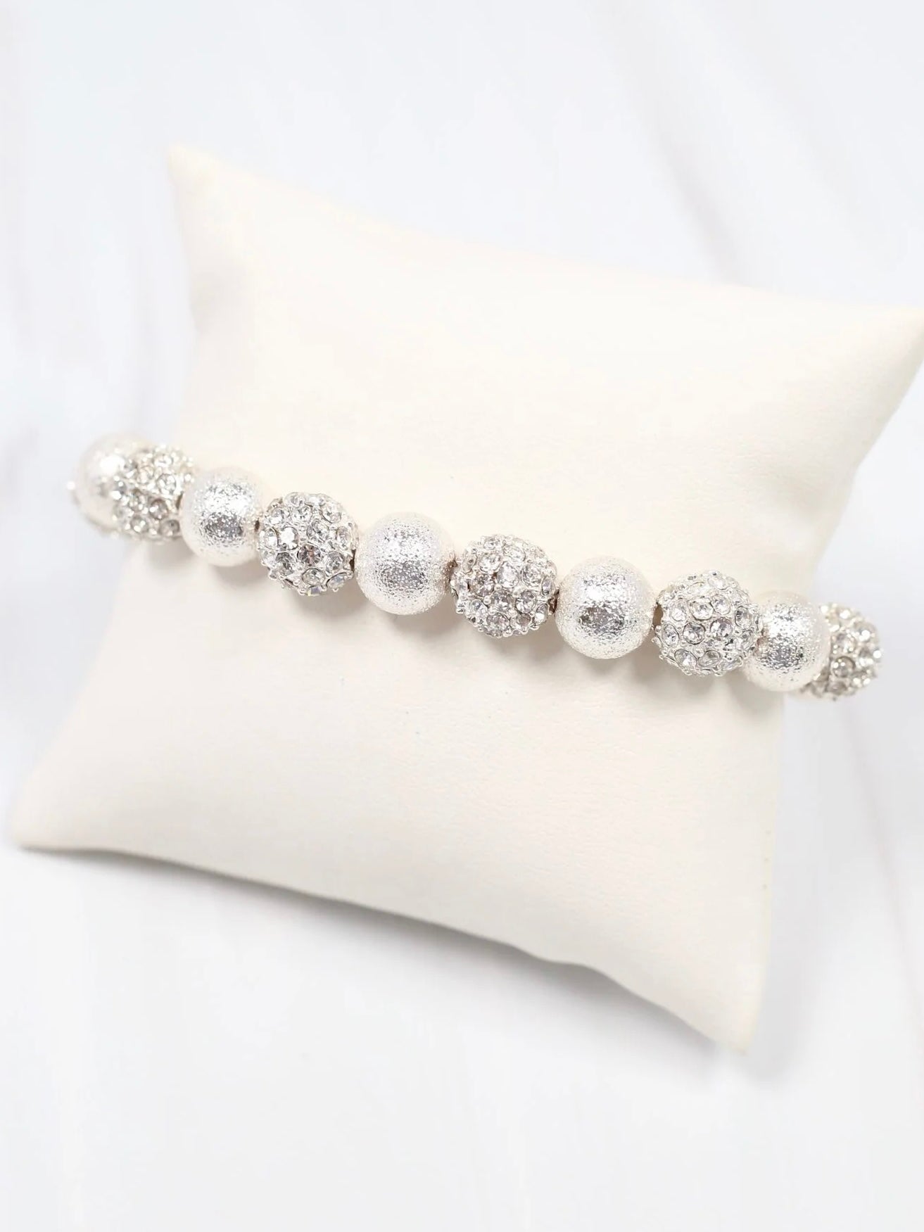This gorgeous bracelet has CZ covered ball accents as well as textured silver ball accents as well. It has an elegant look and will elevate any outfit! Stretches to fit most wrists.