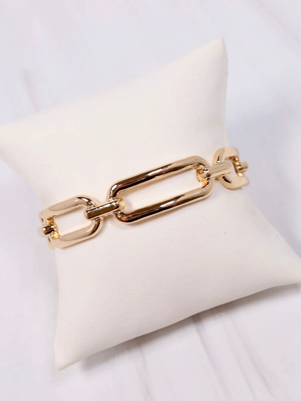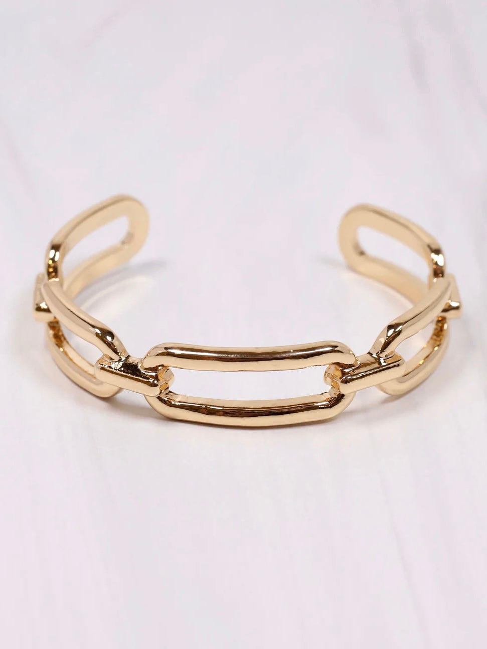 This elongated link cuff has a shiny metal finish. Wear alone or in a stack for a fuller look. One size.