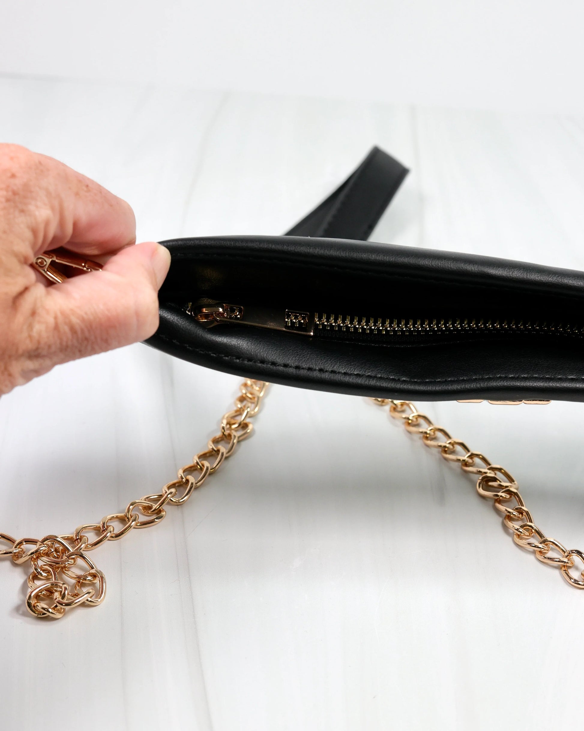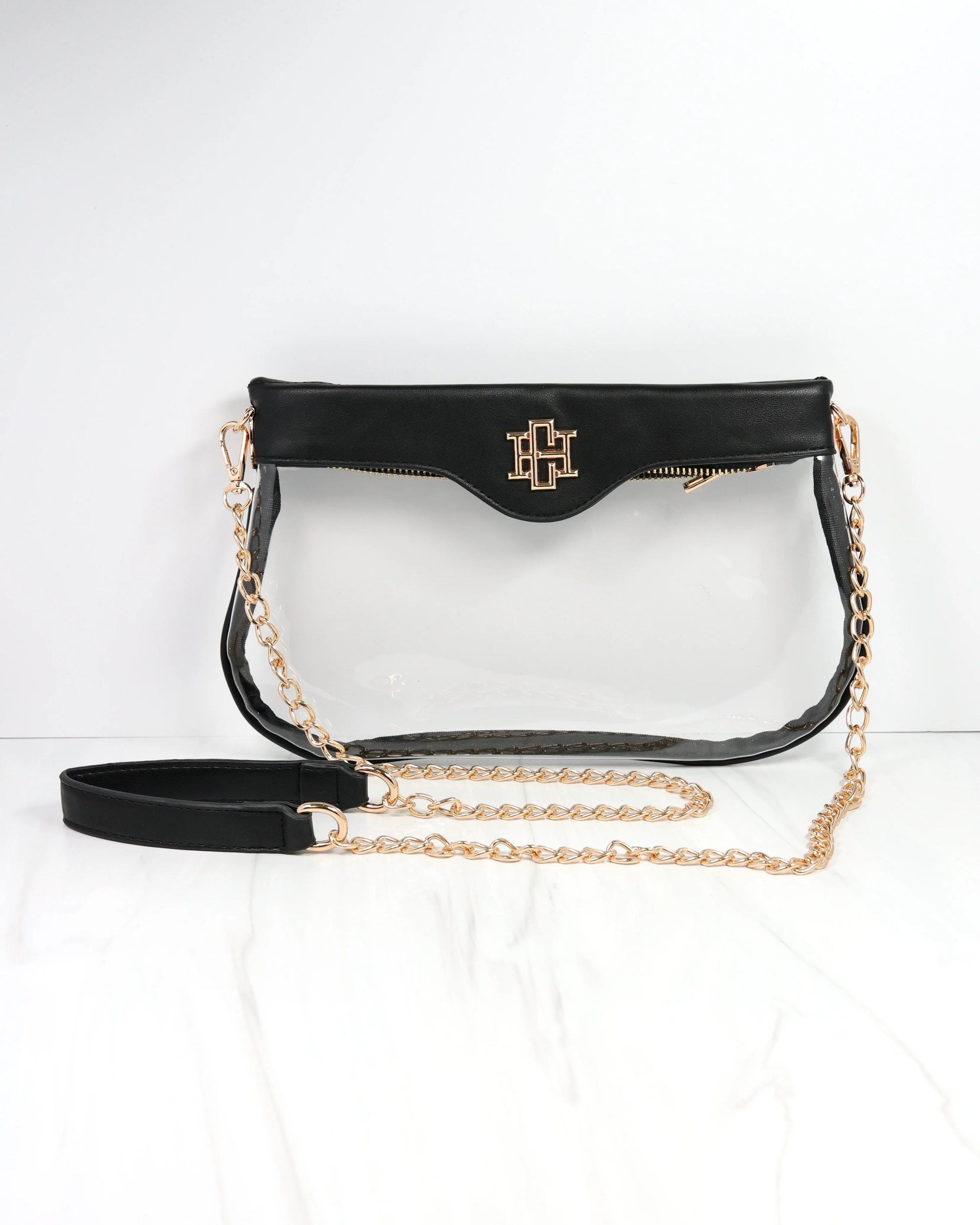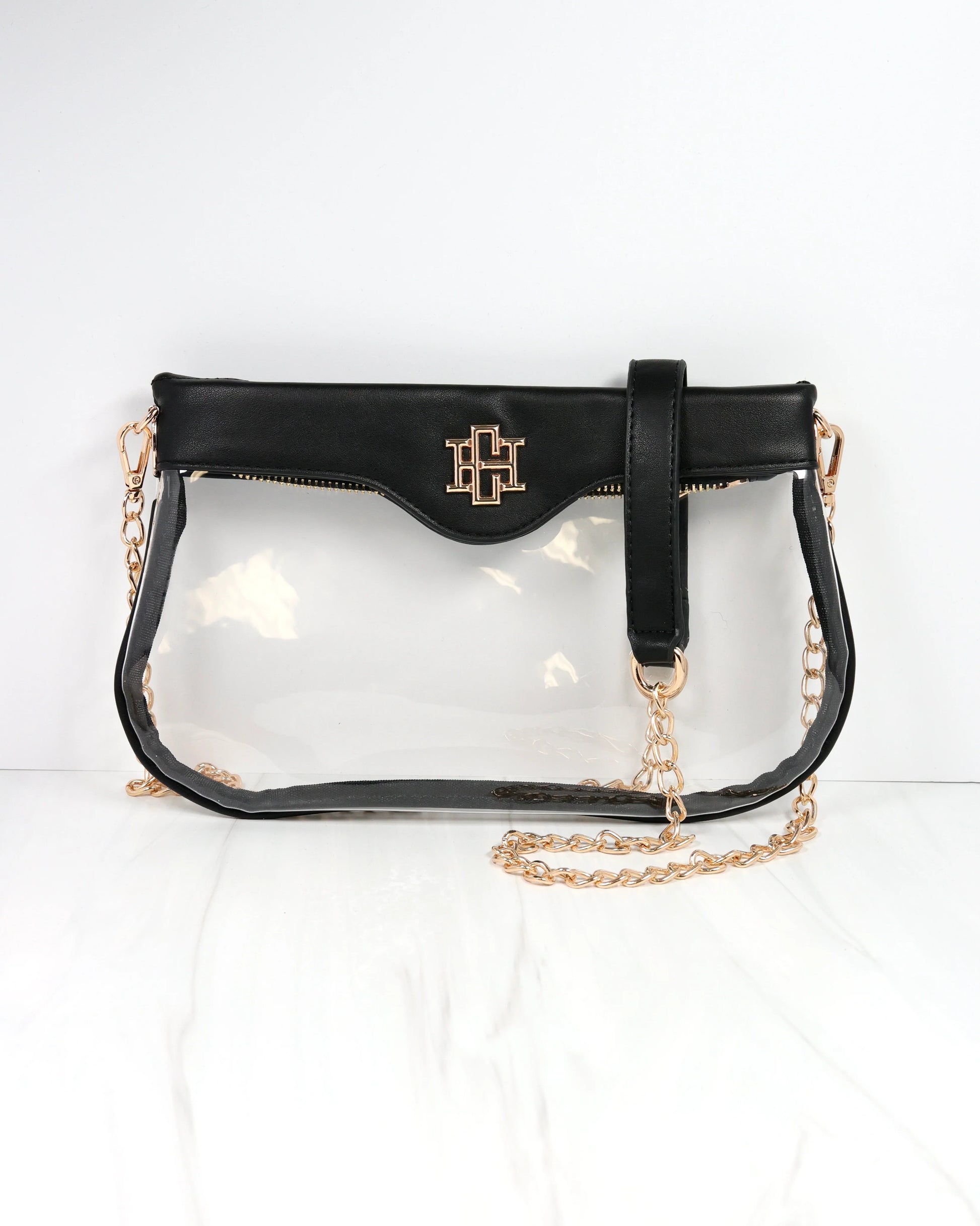 The Madi Clear Crossbody in Black is the perfect accessory for game day, combining style and practicality. Its transparent design meets stadium requirements, while the chic chain strap adds a fashionable touch. Easily pair it with our purse chains, nylon strap, or Molly Card Holder to customize your look and keep essentials close at hand.