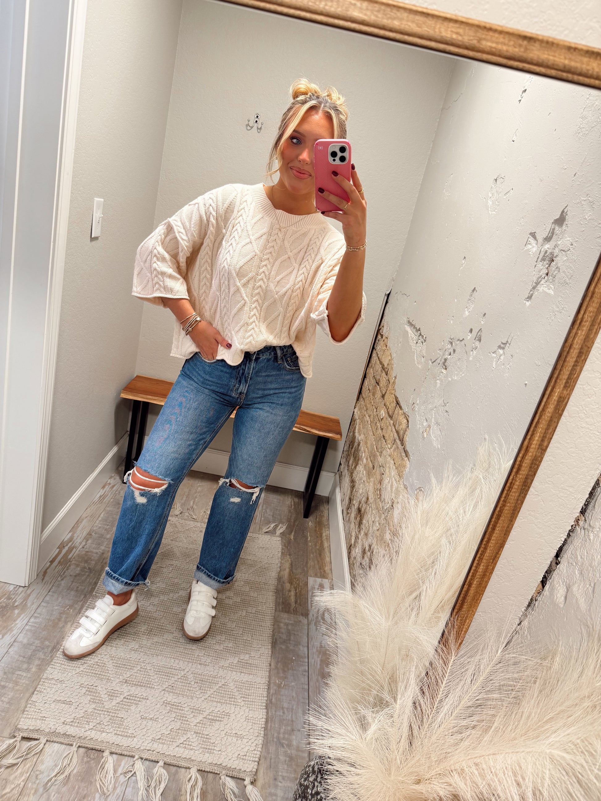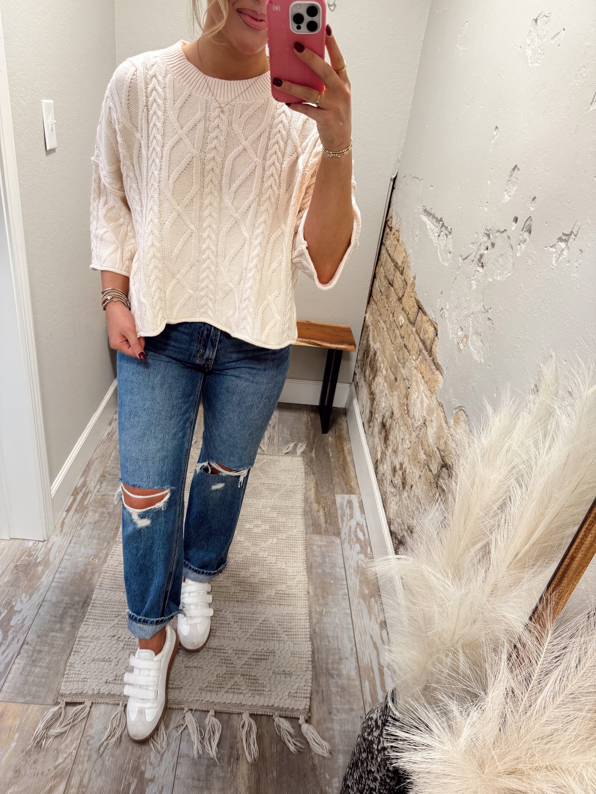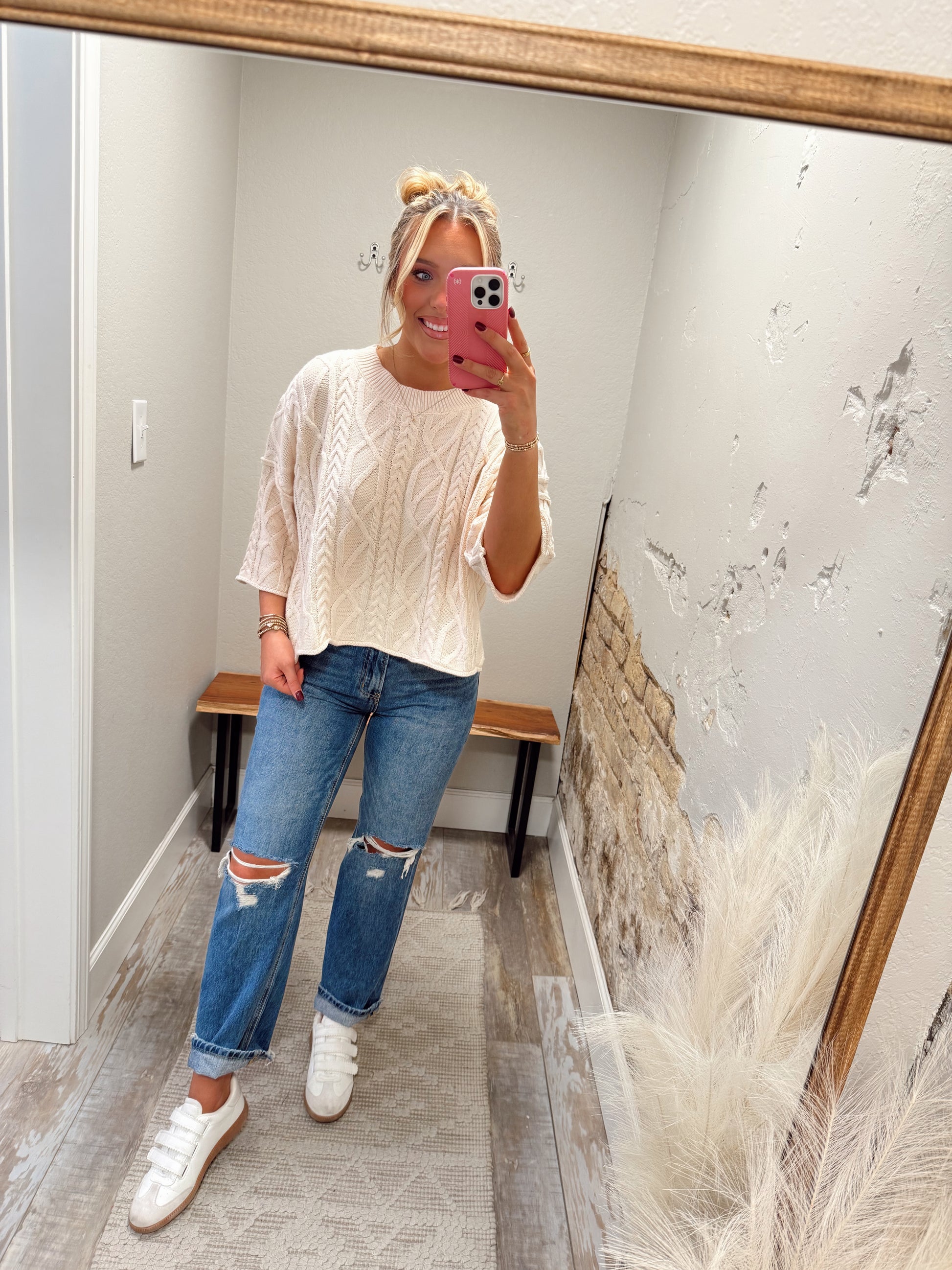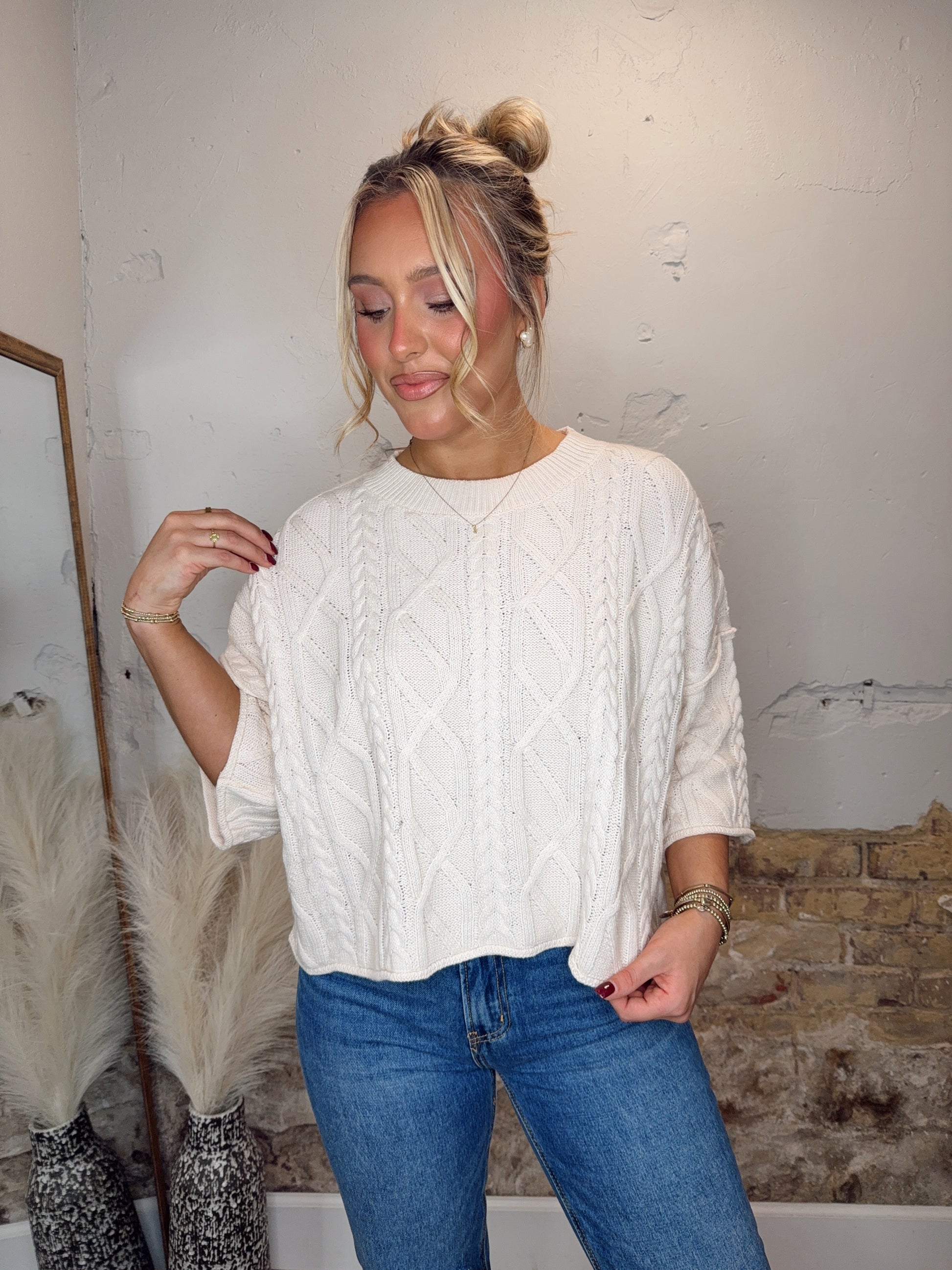 - Slip into the Make It Easy Top—a cozy, solid sweater knit pullover with fun ¾ sleeves that bring just the right touch of flair. Perfect for layering or wearing solo, this playful piece keeps things comfy and effortlessly stylish all day long.