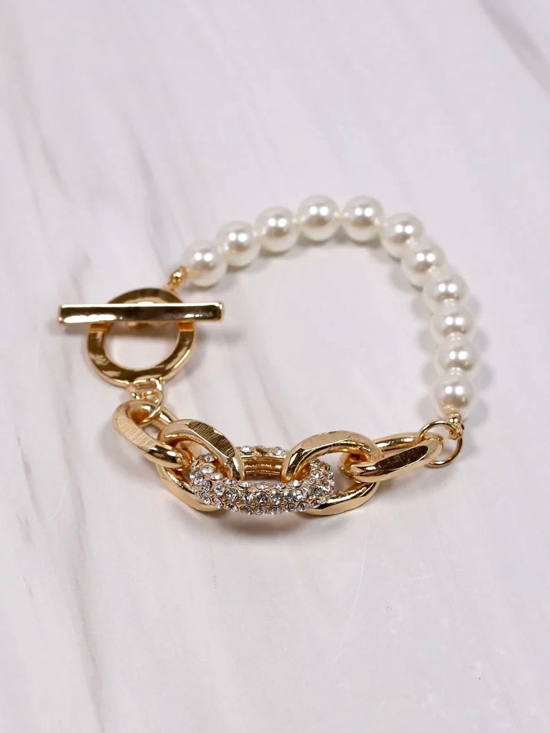 This toggle bracelet is gorgeous! It has shiny gold links, pearls, and a single CZ covered link accent as well.