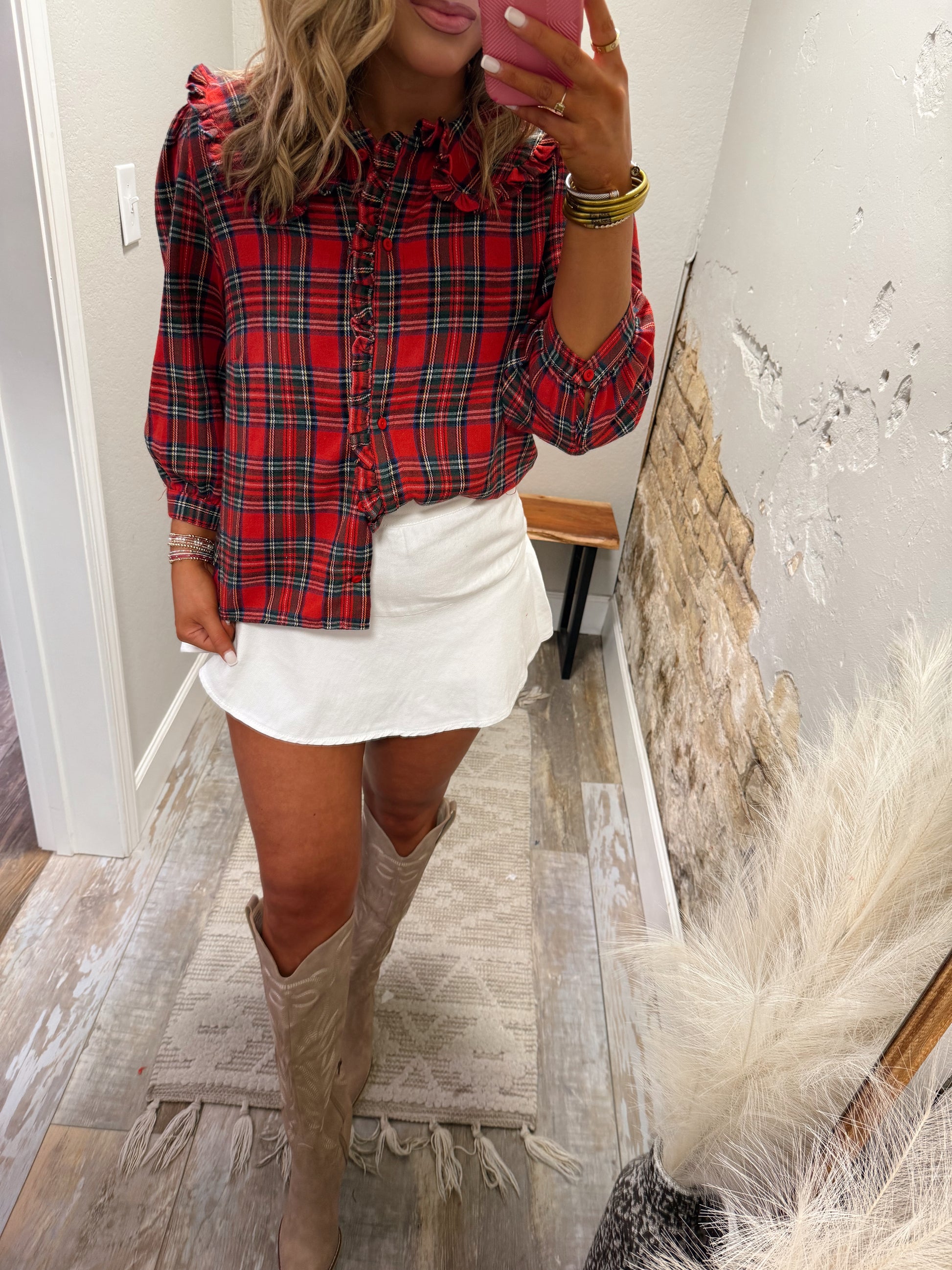 Elevate your holiday wardrobe with this charming Merry Moments Top, featuring a playful ruffled collar and functional buttons for effortless styling. The girly, trendy design makes it perfect for festive gatherings, casual outings, or cozy nights in. A must-have essential that brings joy and personality to every season.