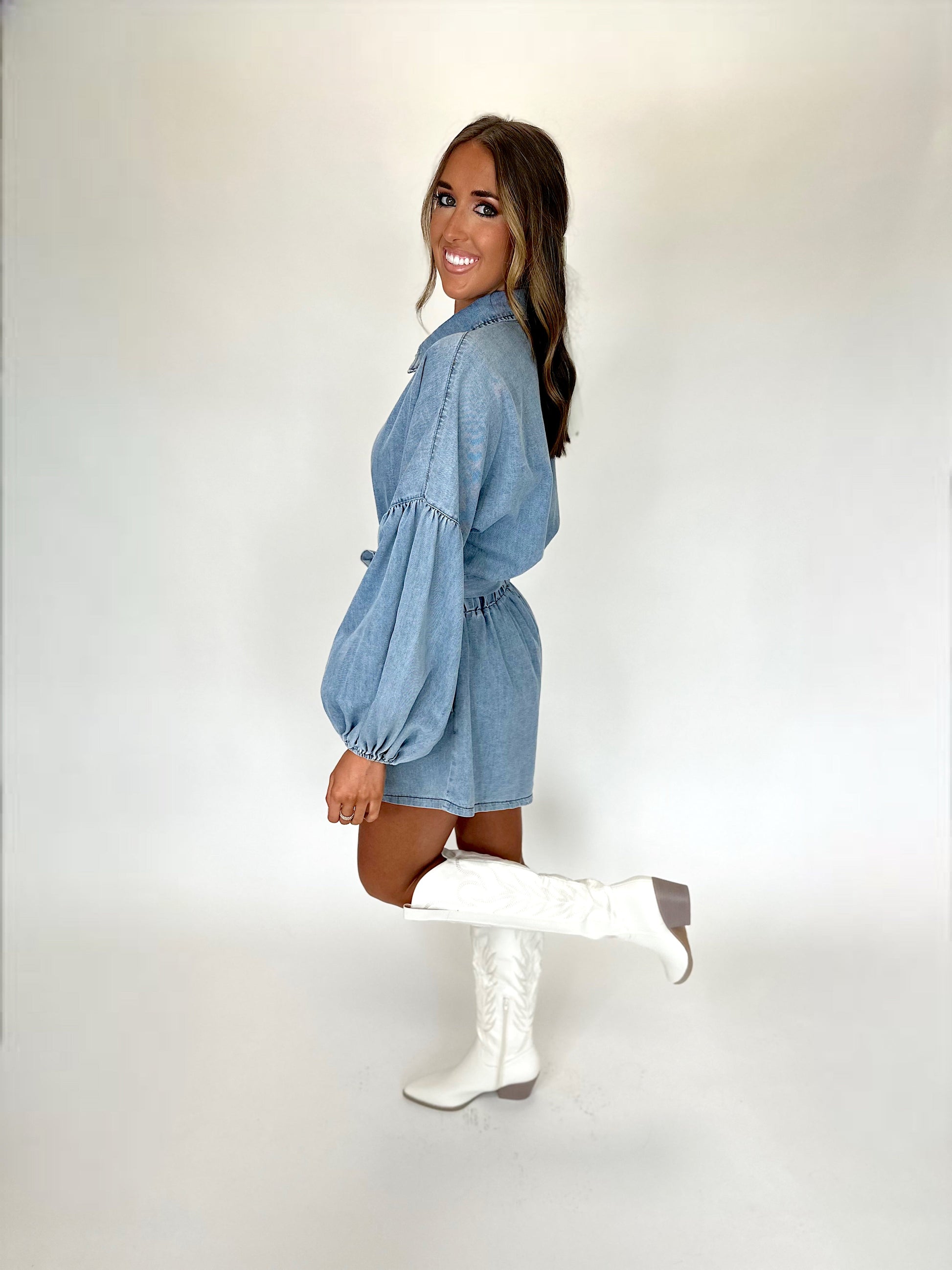 - Own the night in this playful Nashville Nights denim romper. With long balloon sleeves and a button down collared shirt design, this romper is both trendy and comfortable. The self tie belt adds a touch of fun while accentuating your figure.