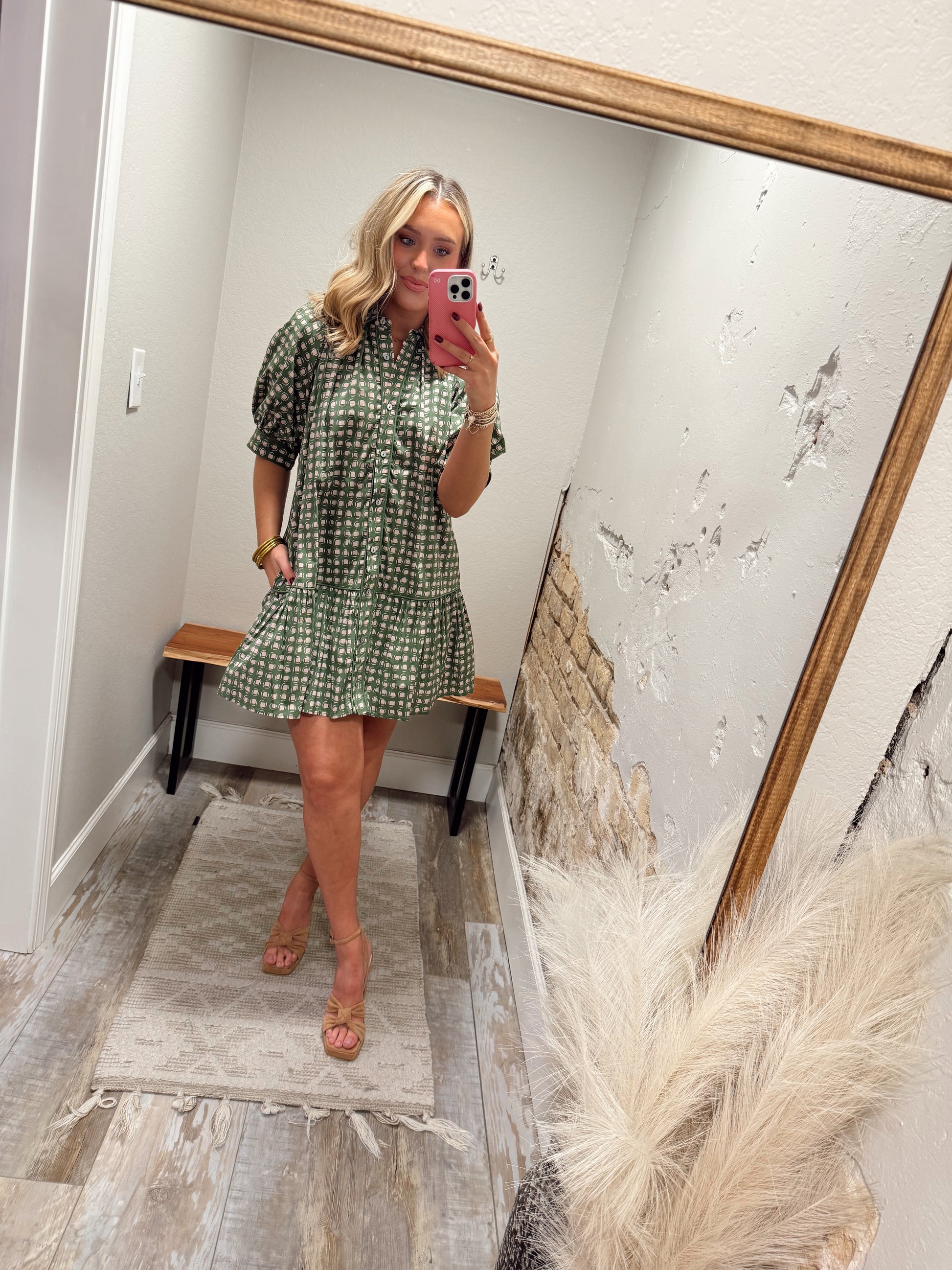 - The Neutral Babe Dress is an ideal fall wardrobe addition with its geometric print and short puff sleeves. It features a button-front closure, side pockets, and a shirt collar for timeless appeal. The lined mini dress ends with a ruffle hem, combining comfort and subtle elegance perfect for the season.