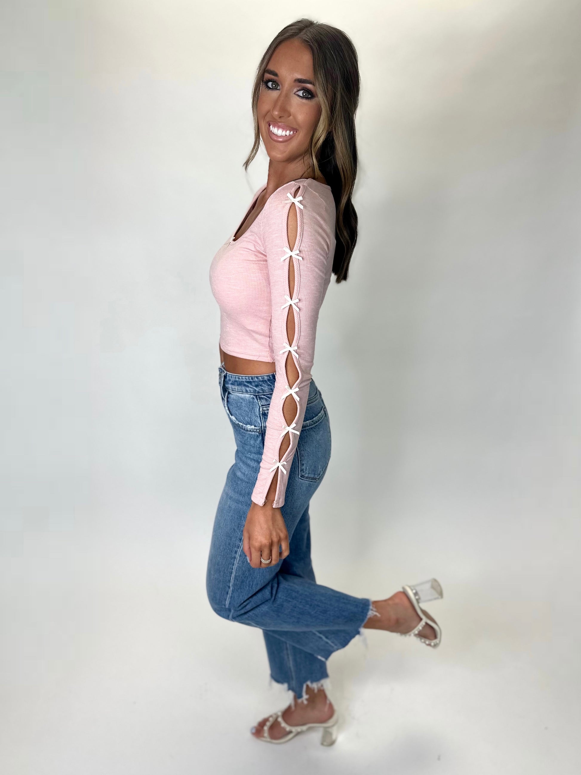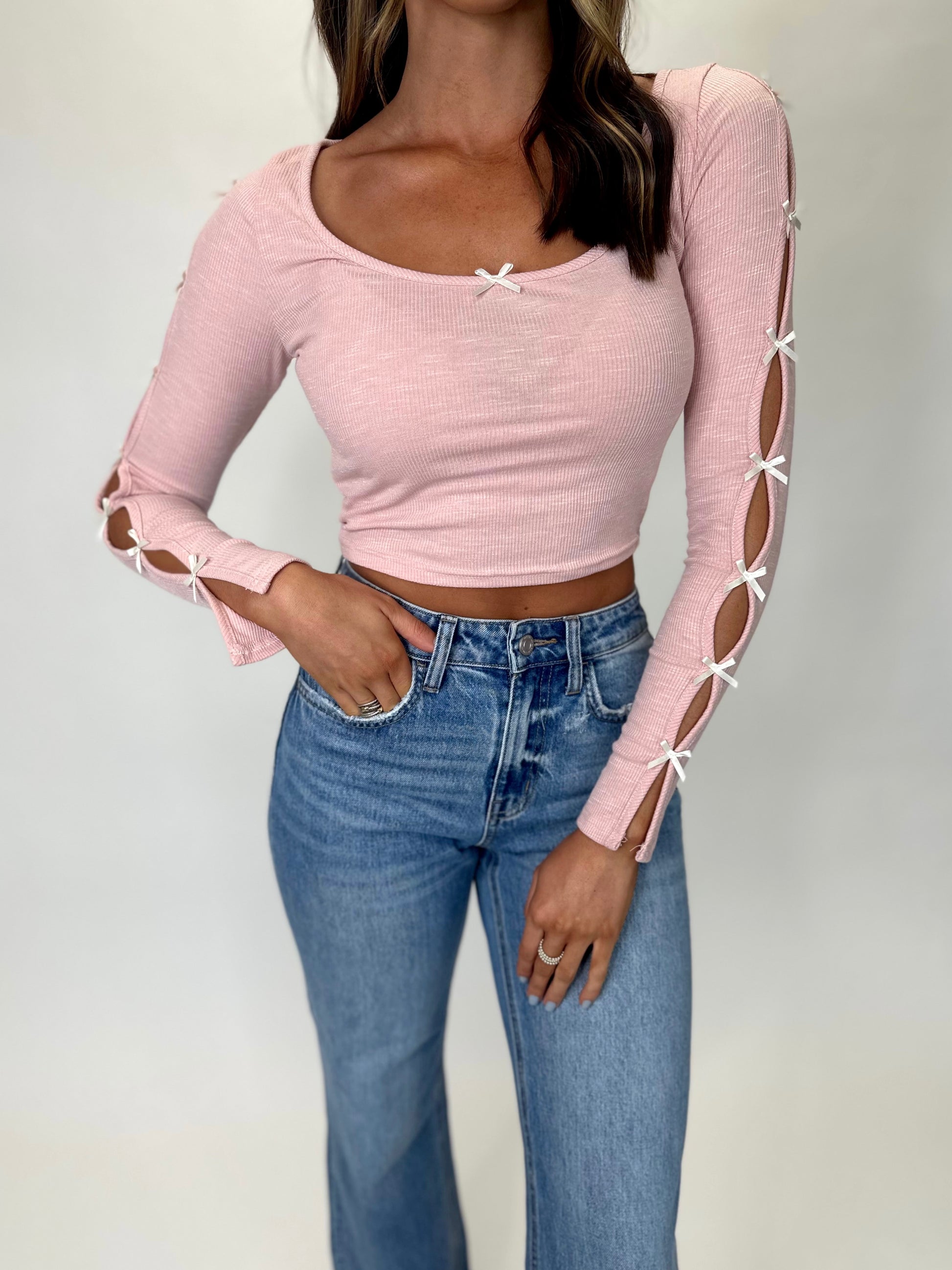 Elevate your wardrobe with our Peekaboo Bow Top in Dusty Pink! Made from ribbed knit fabric, this top features a playful peekaboo cutout and elegant bow trim detail throughout. Effortlessly stylish, it's perfect for day or night and adds a touch of fun to any outfit. Stay on trend with this cropped length top!