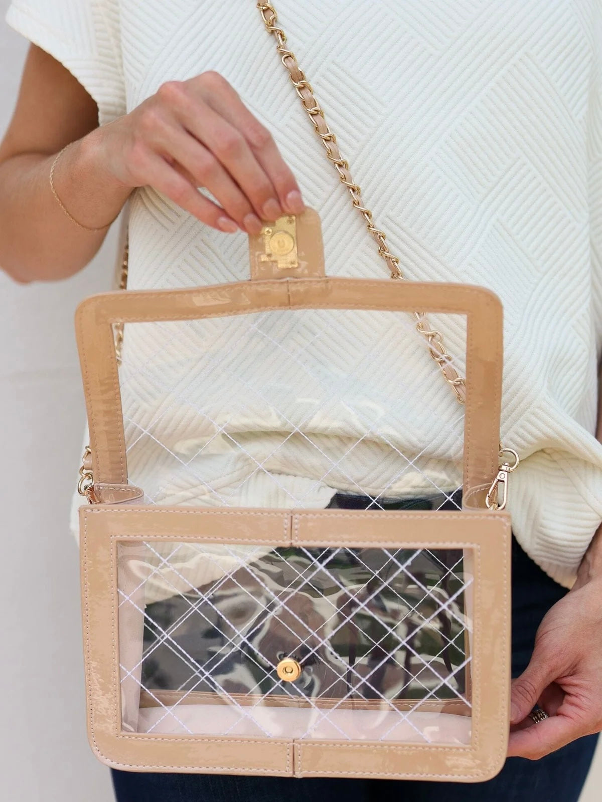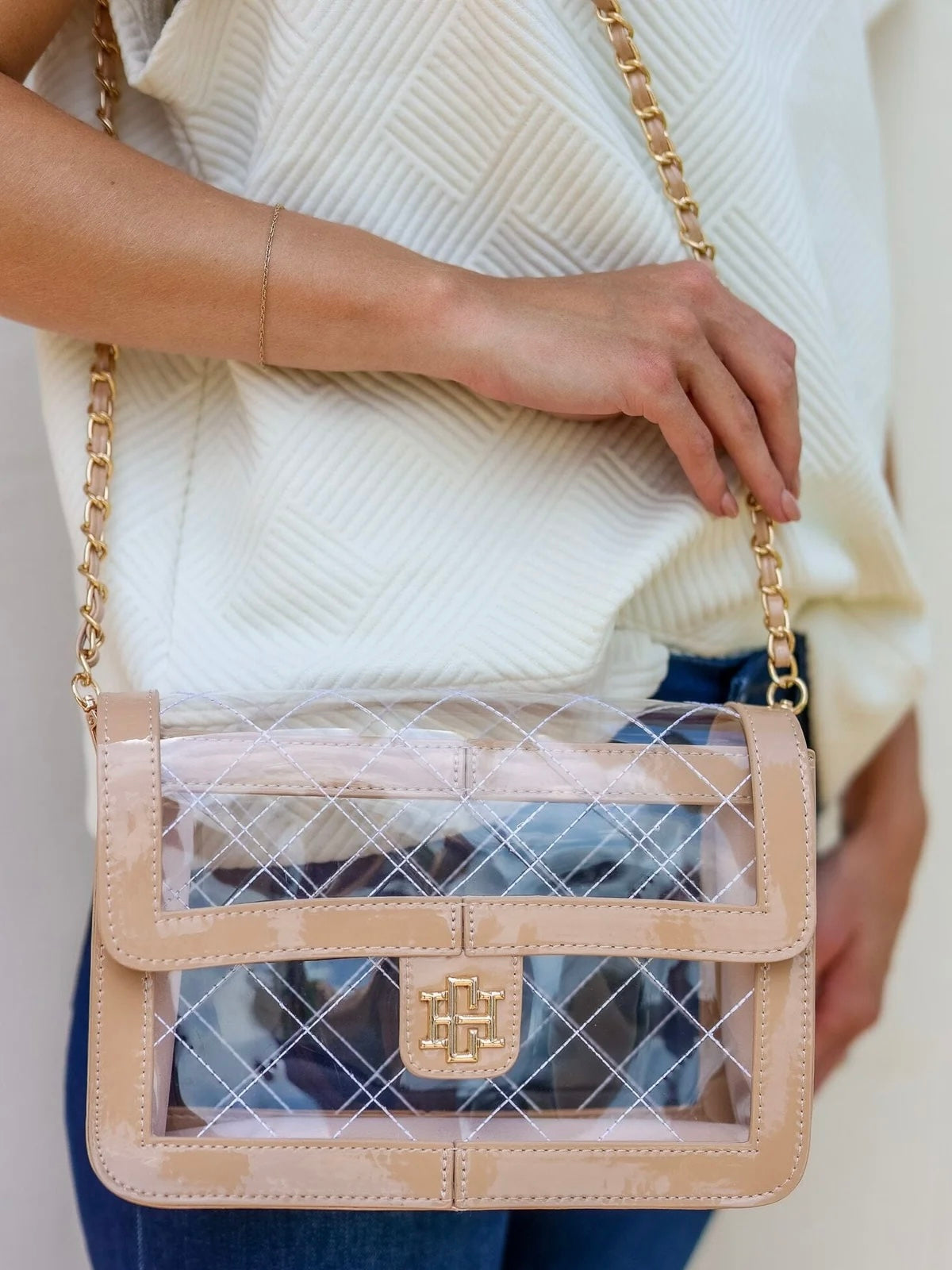 This clear handbag has such an elevated look! Our favorite quality on this bag is the threaded, quilted pattern featured on the front, top, and back of the bag. It has a patent trim with the Caroline Hill logo on the front magnetic flap. The interior base and sides of the bag are lined with a soft, suede-like material. The braided crossbody strap is removable and features a matching patent strip of material to fit comfortably on the shoulder.
