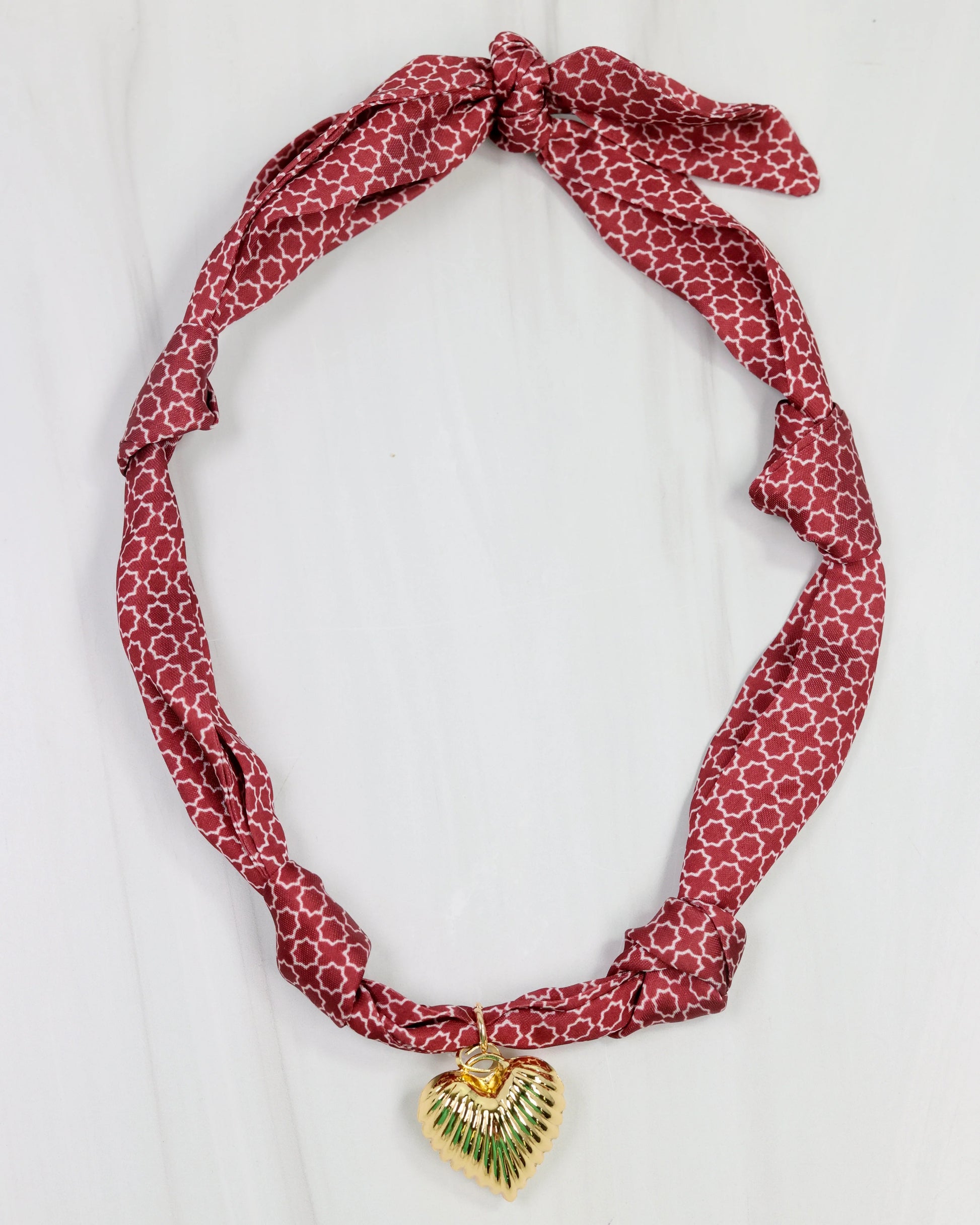 Elevate your look with our Scarf Charm Necklace featuring a classic black and white print. This satin-feel scarf is accented by a ribbed puff heart charm pendant, adding a playful yet chic touch. Designed with two stylish knots and a tie-back closure, it offers adjustable comfort and a perfect fit for any outfit.
