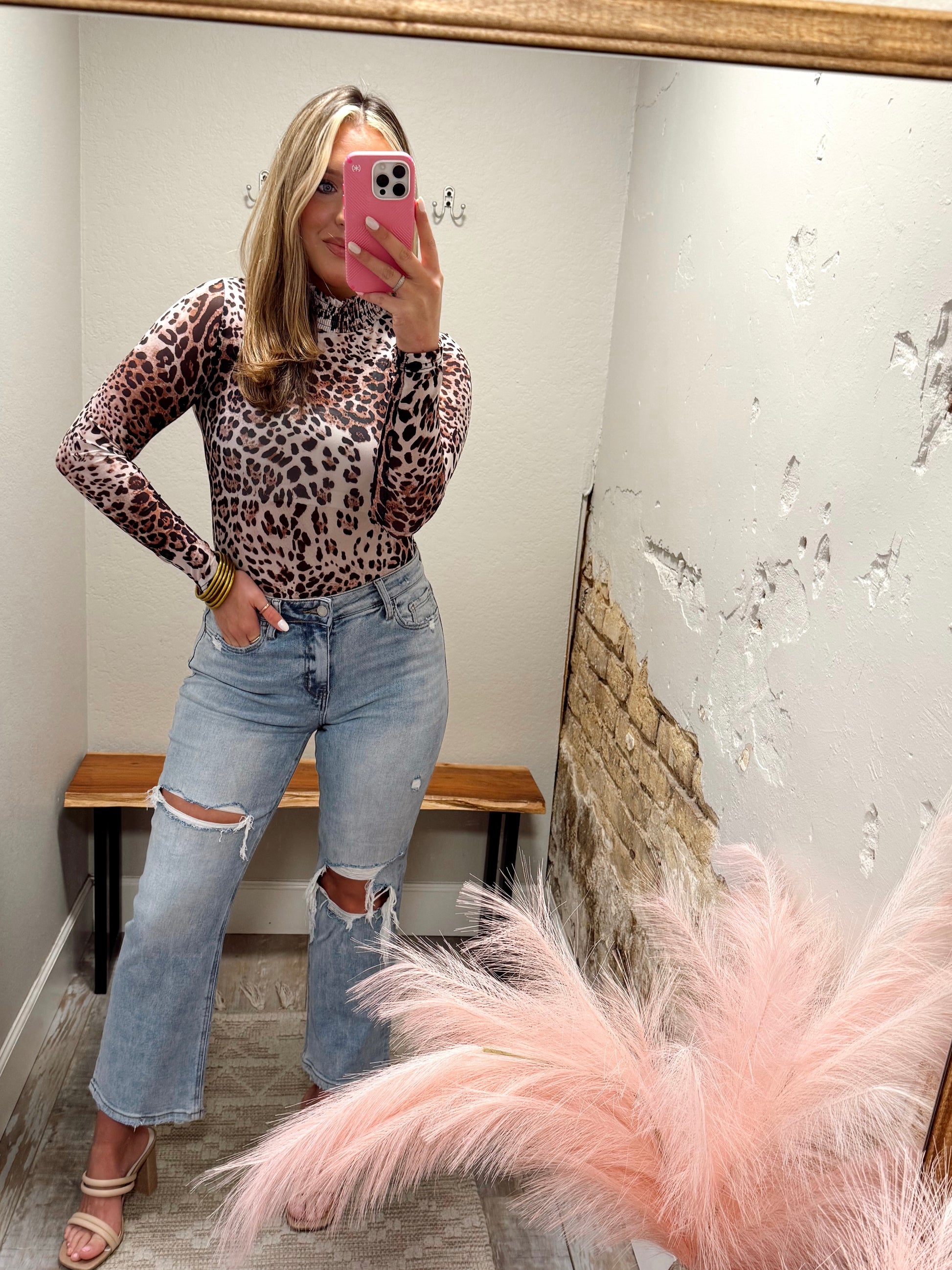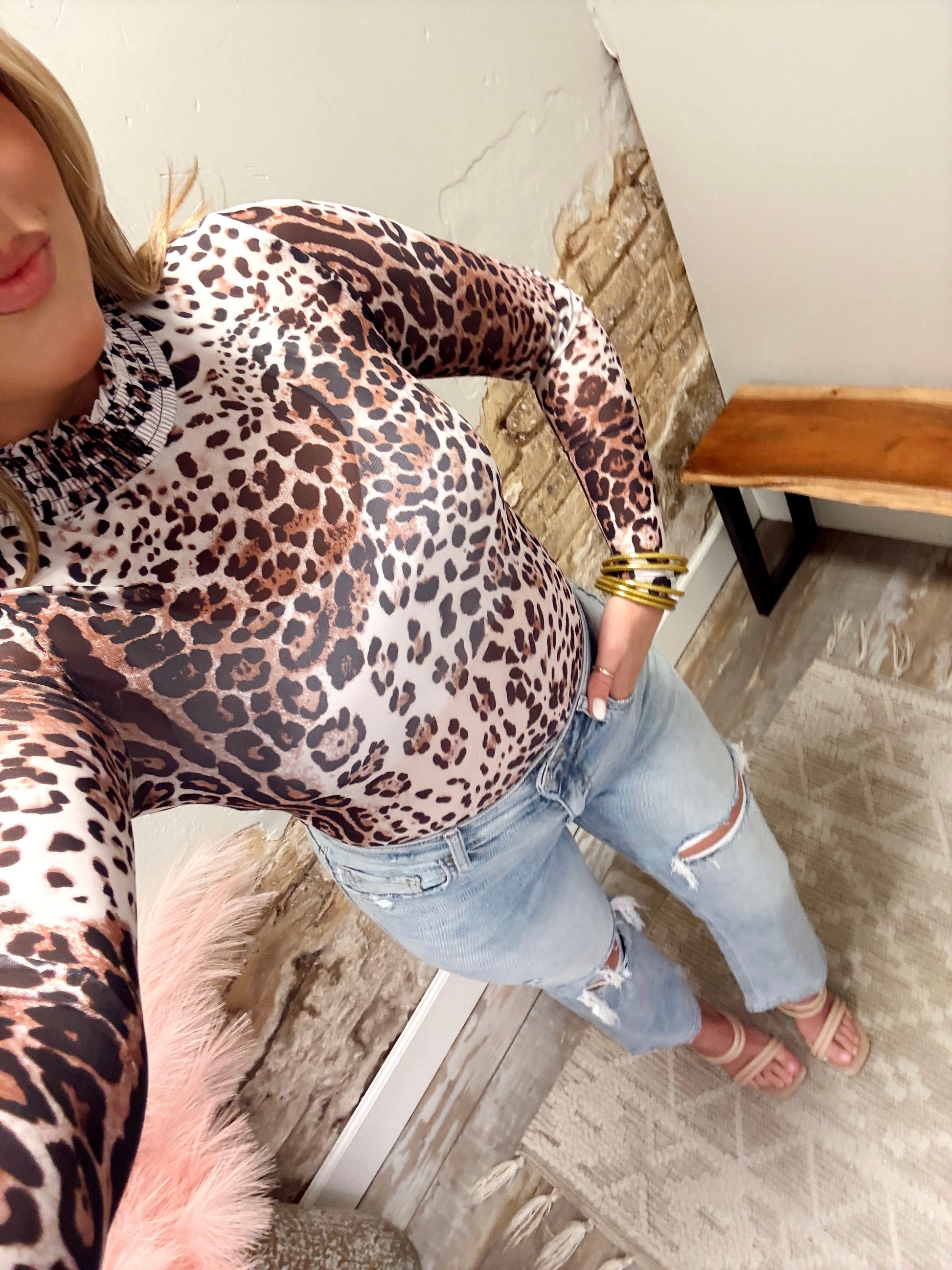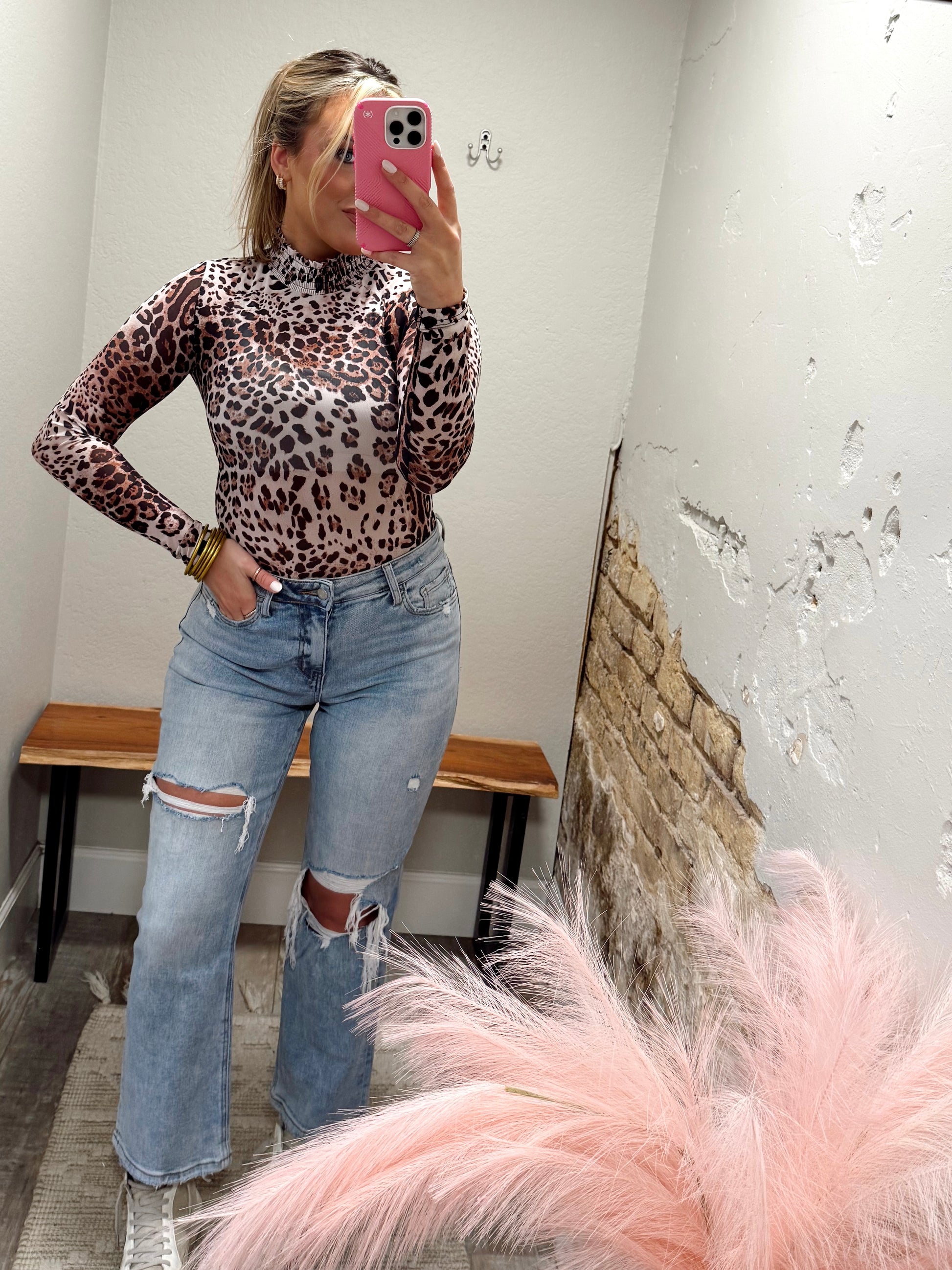 Elevate your wardrobe with our Sheer Bliss Bodysuit. The playful leopard print and sheer material add a touch of sass to your look. The smock neck adds a relaxed yet stylish vibe, perfect for layering or dressing up or down. Top is see through! Model has it layered with a bralette!