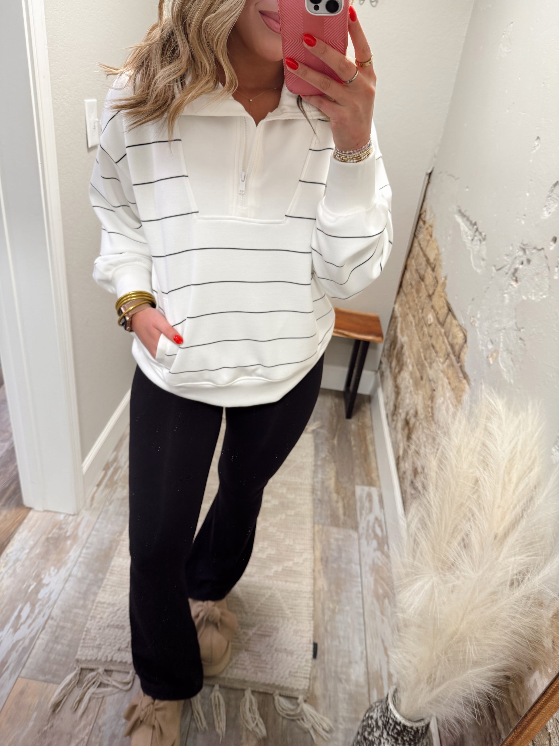 - Crafted from silky smooth and lightweight Modal Poly Span Scuba fabric. This luxurious, striped pullover features a relaxed fit with a stylish mock neck and quarter zip closure, complemented by a practical kangaroo pocket. Perfect for lounging or on-the-go, this pullover combines comfort with elegance for any casual occasion.