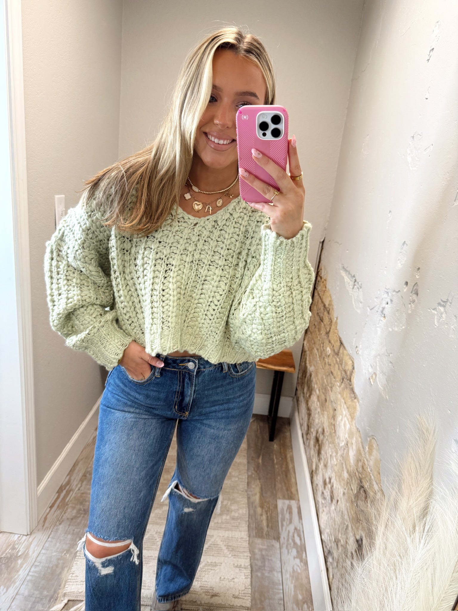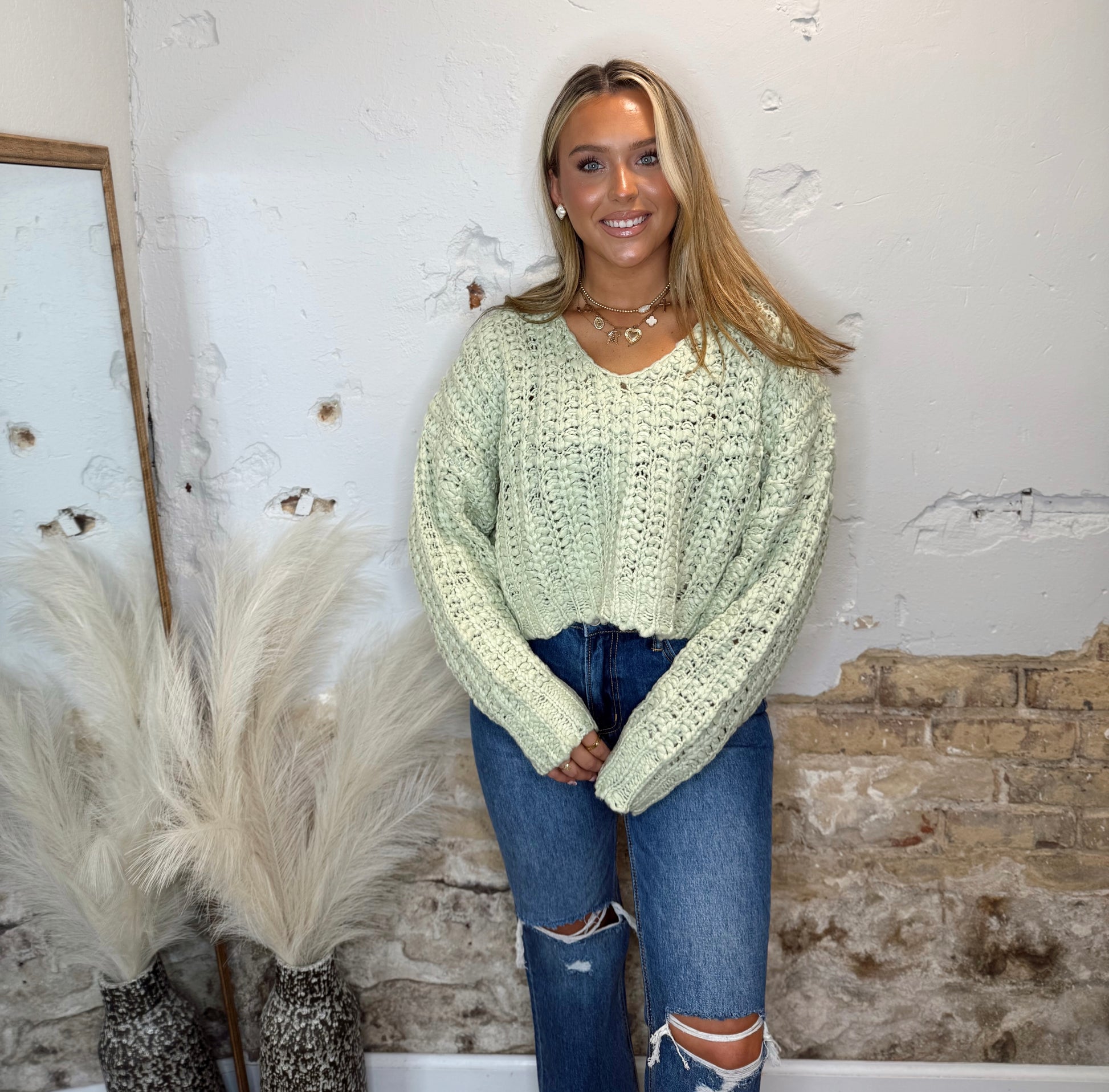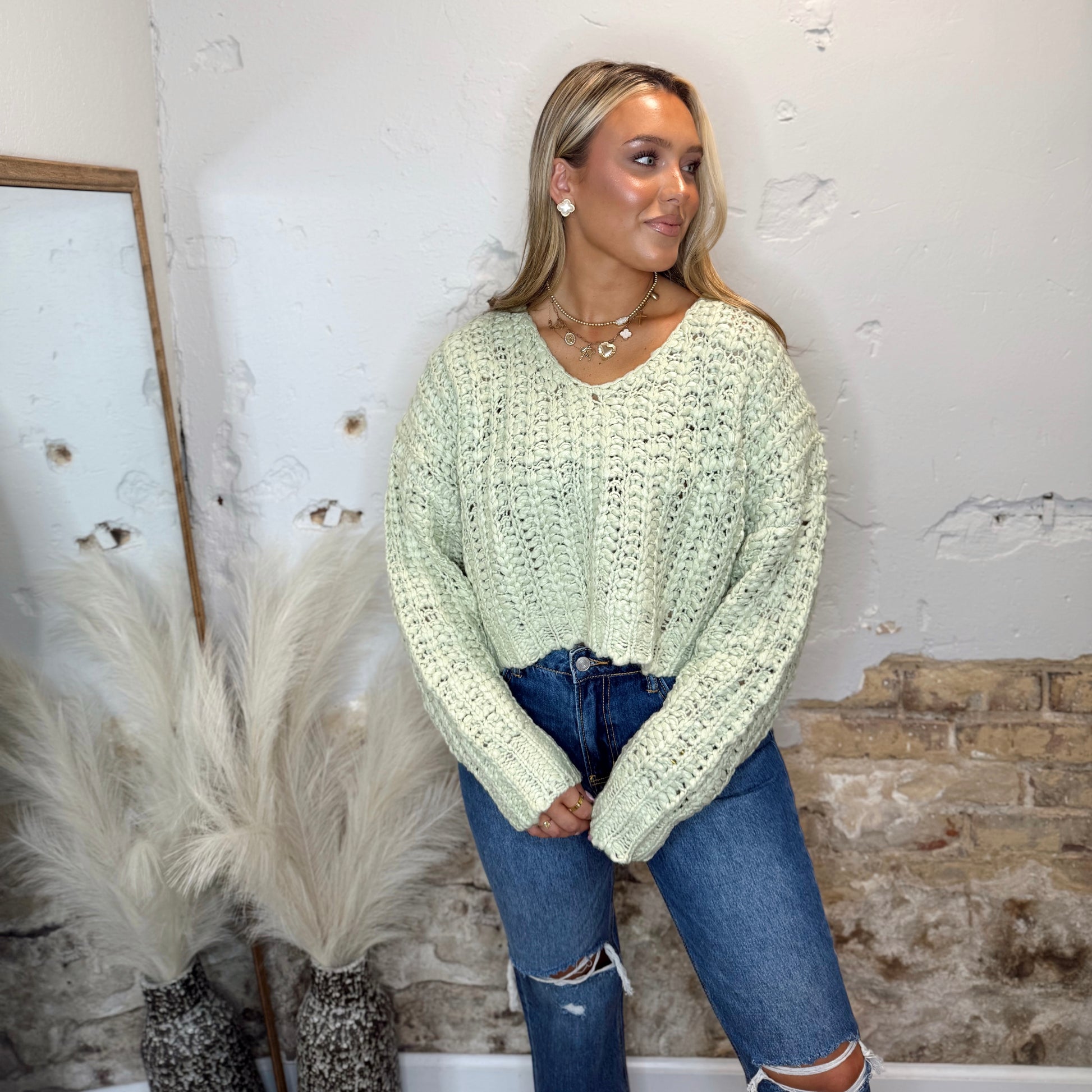 - The Soft Season Sweater features a cozy popcorn yarn texture and a flattering V-neck cropped design. This sweater provides gentle warmth and a comfortable fit, making it perfect for layering during cooler days. Its soft fabric and relaxed style support your comfort while adding a stylish touch to your wardrobe.