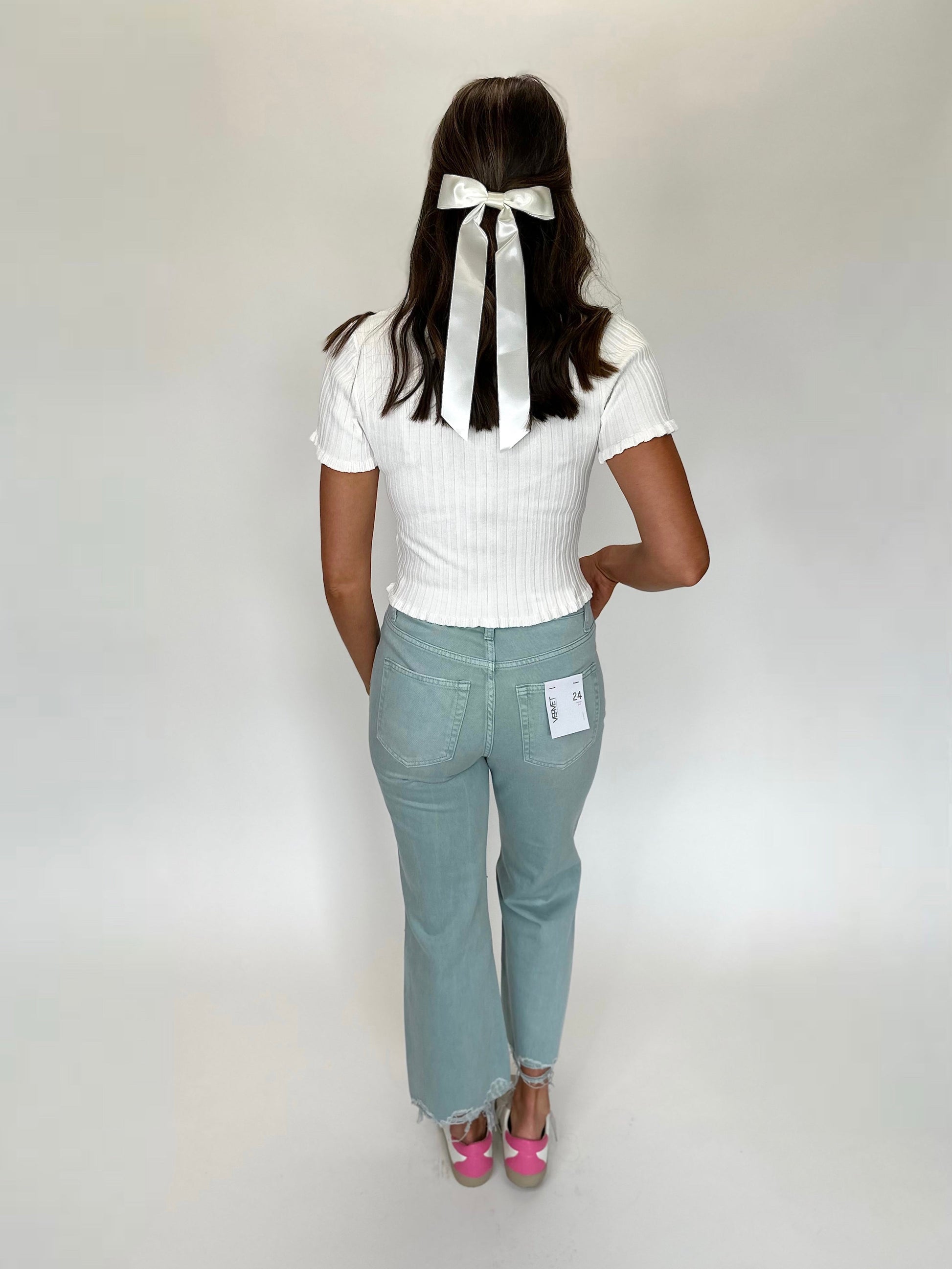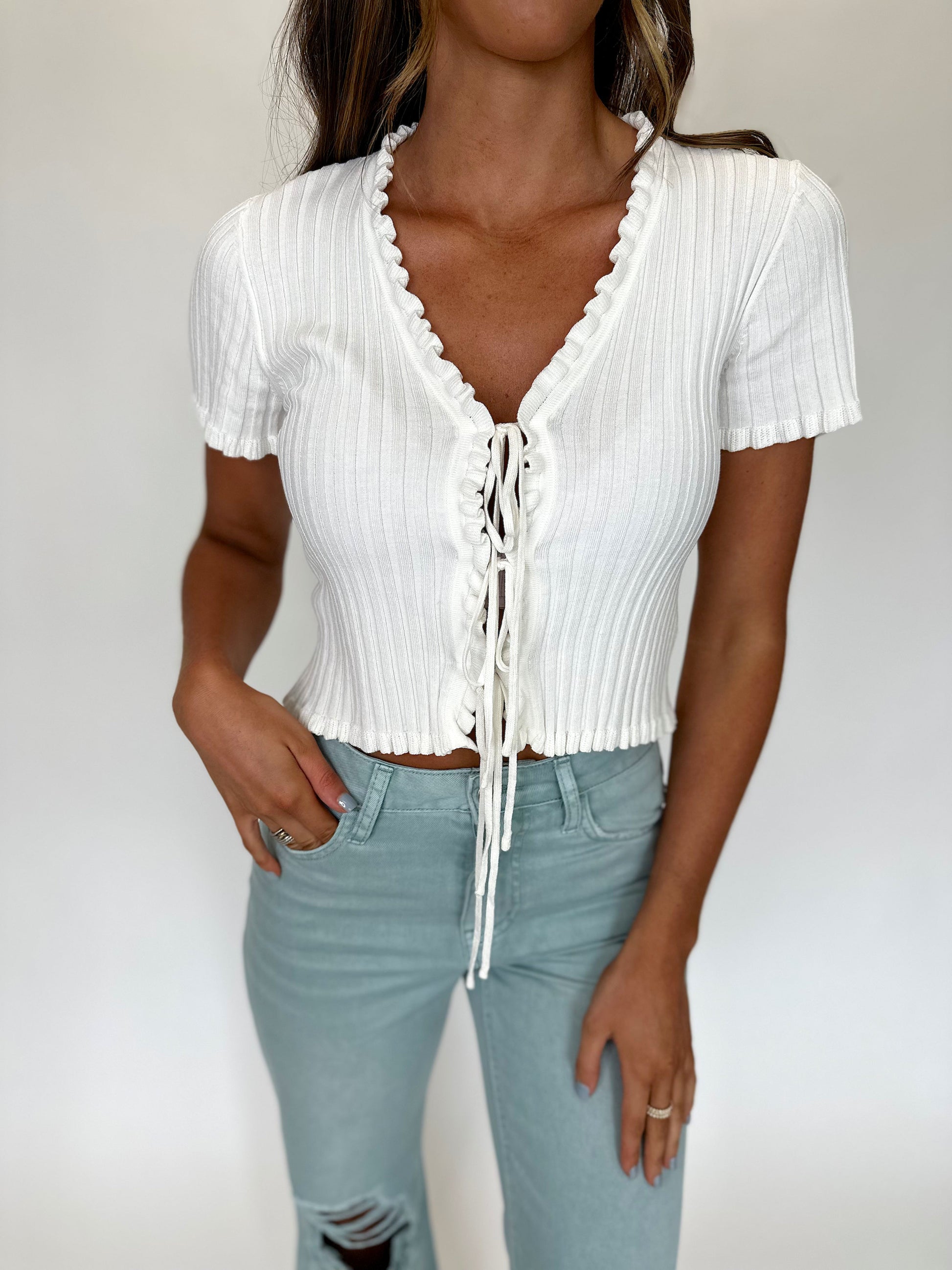- Indulge in the sweetness of this ribbed knit top. Adorned with 3 front self tie bows, it adds a playful touch to any outfit. The ruffled hem adds a flirty flair. Promises of style and charm are guaranteed with this must-have piece.