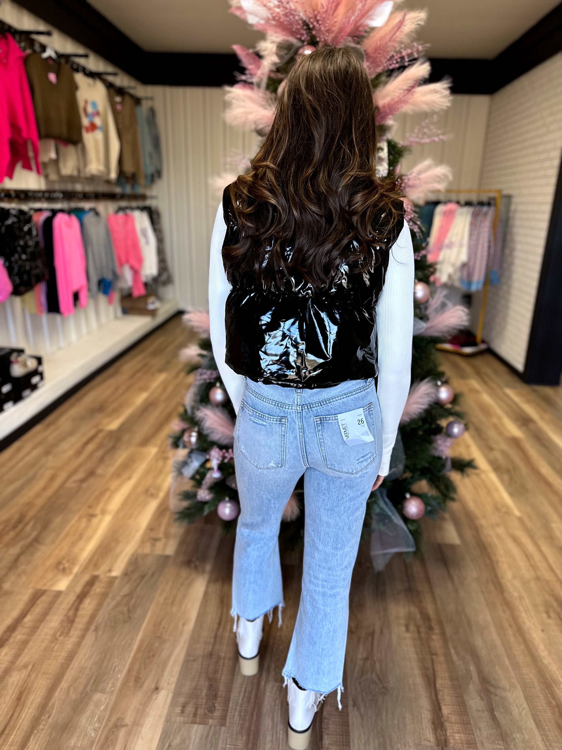 - Stay stylish and warm with our Trendy Puffer Vest in black! This glossy faux leather vest features a zipper front closure, side pockets, and a cropped hem. Perfect for layering, this vest adds a touch of edginess to any outfit.