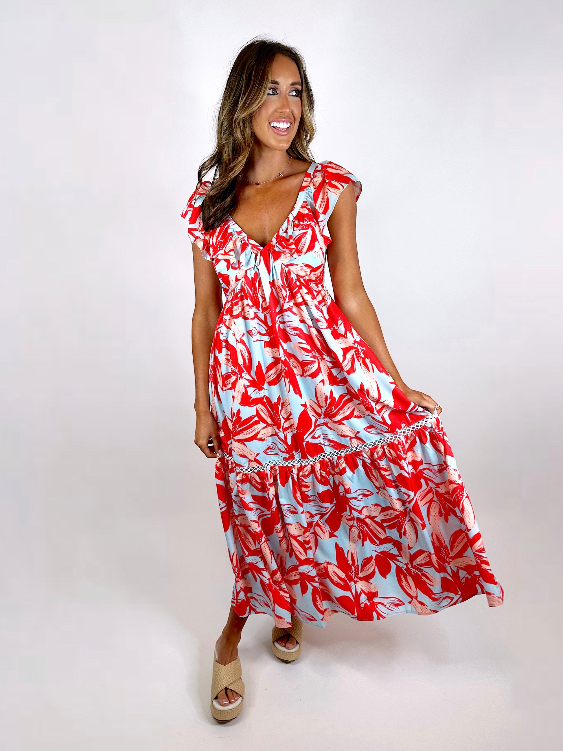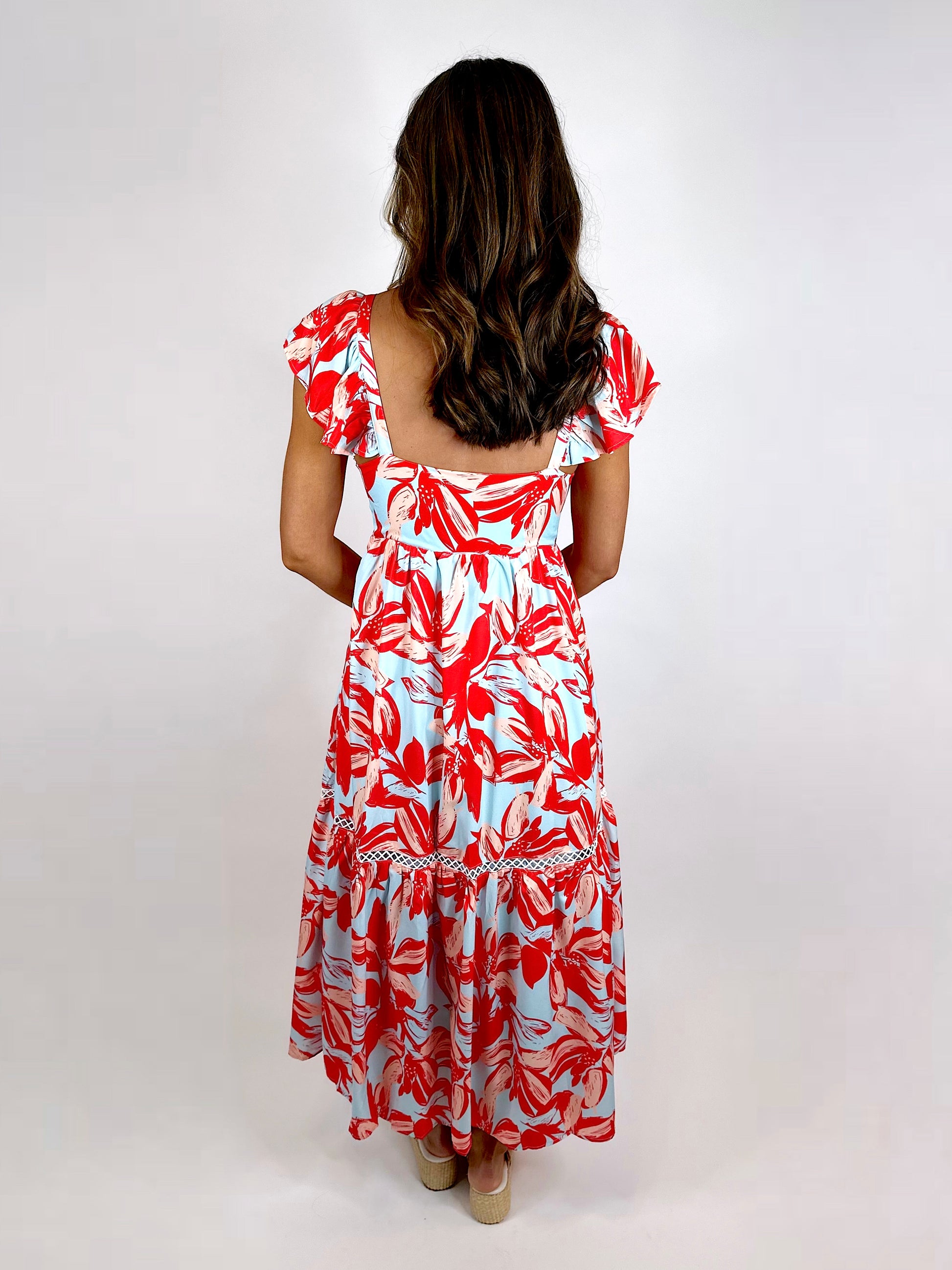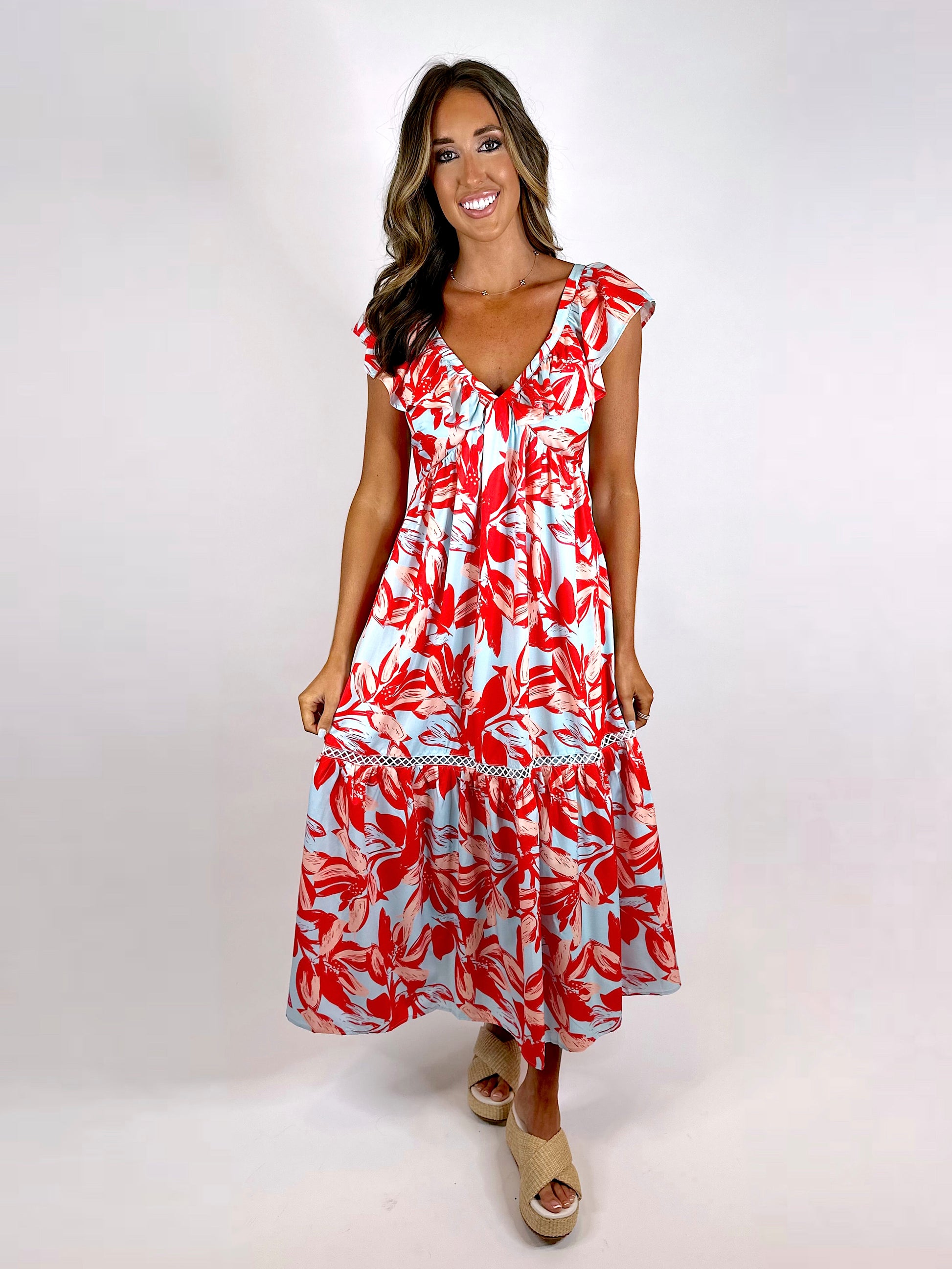 - Experience the vibrant energy of the tropics in our Tropical Sunrise Midi Dress! This stunning midi dress boasts a colorful print, with playful ruffles adorning the neckline and sleeves. The concealed side zipper ensures a flattering fit, while the fully lined skirt adds comfort and coverage. Make a statement in this must-have dress on vacay!